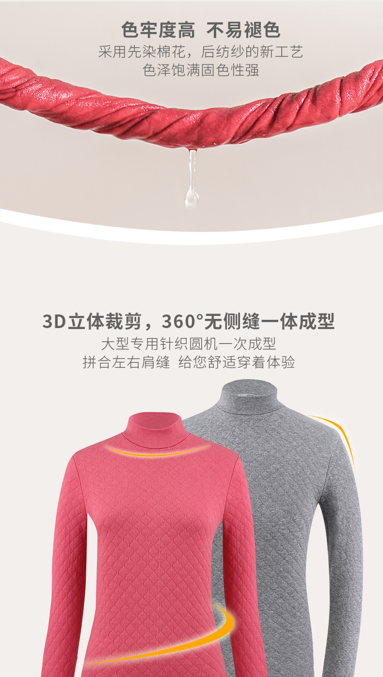 细节上:3D立体剪裁,合体版型,大身360°无侧缝一体成型,拼合左右肩缝,贴合身材穿着更舒适,5cm半高领抗寒设计,袖口、脚口双层加厚螺纹,穿着不松脱、锁住温度,防止冷风钻入,面料采用先染后纺纱工艺,色牢度高不易掉色,可机洗好打理。
