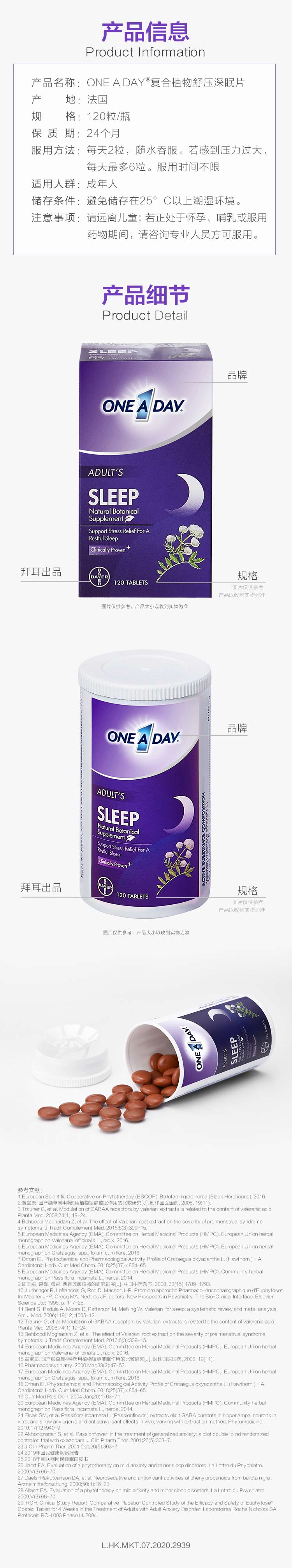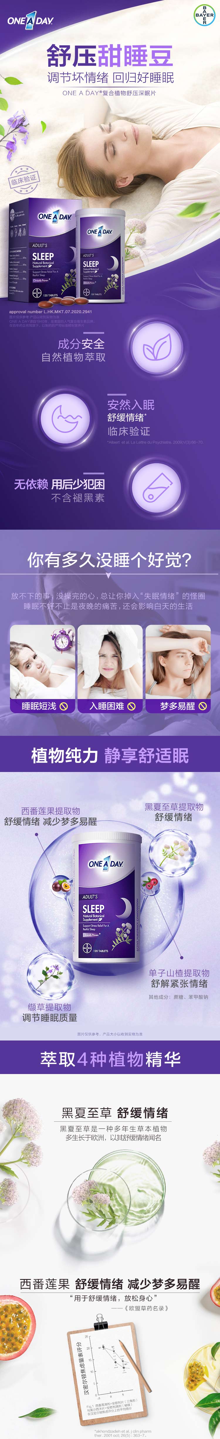 这款One A Day 舒压睡眠片,美国原产,自然萃取植物成分配方,西番莲果提取物、黑夏至草提取物、单子山楂提取物、缬草提取物,无激素、无依赖,可长期食用。