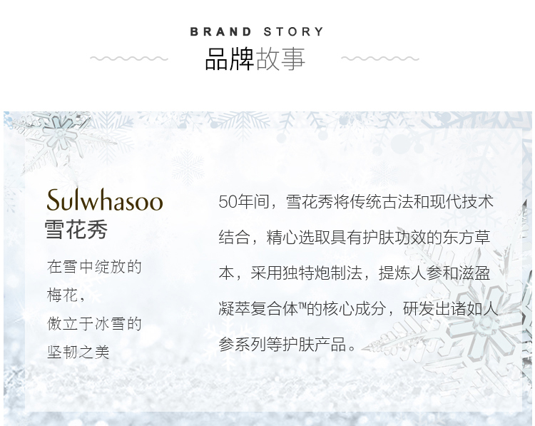 Sulwhasoo雪花秀是行太平洋集团爱茉莉旗下的品牌,(旗下包括大家熟知的定位一线的兰芝、二线的梦妆、平价的爱丽等),雪花秀定位高端顶级,走的是韩方中药路线,擅用人参等重要药材,创立于1997年,于2011年进入中国市场。