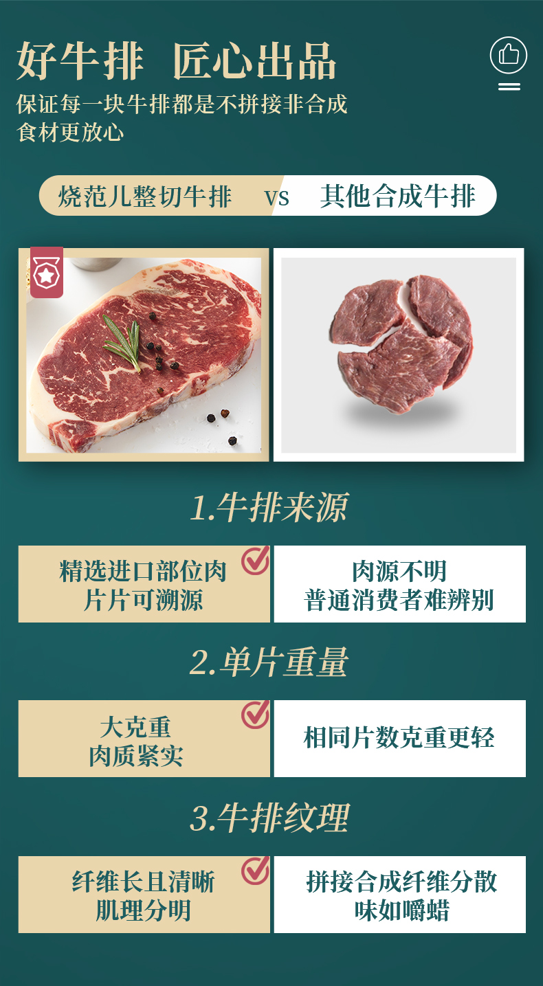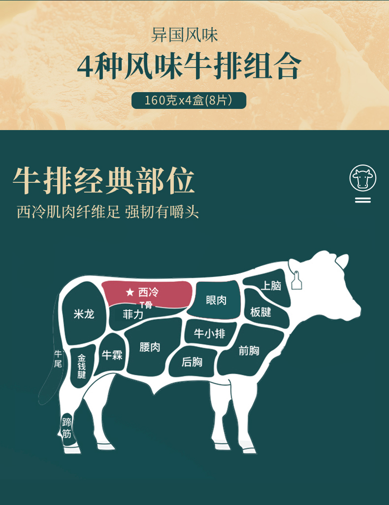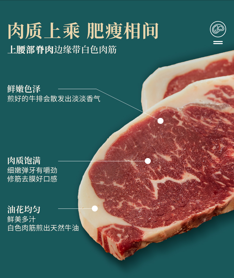 这款西冷原肉整切牛排,肉质鲜嫩味美,细嫩多汁,匠心腌制,层层入味,肌肉纤维足,纹理细腻,强韧有嚼头,营养又美味,有检验检疫报告,放心买!
