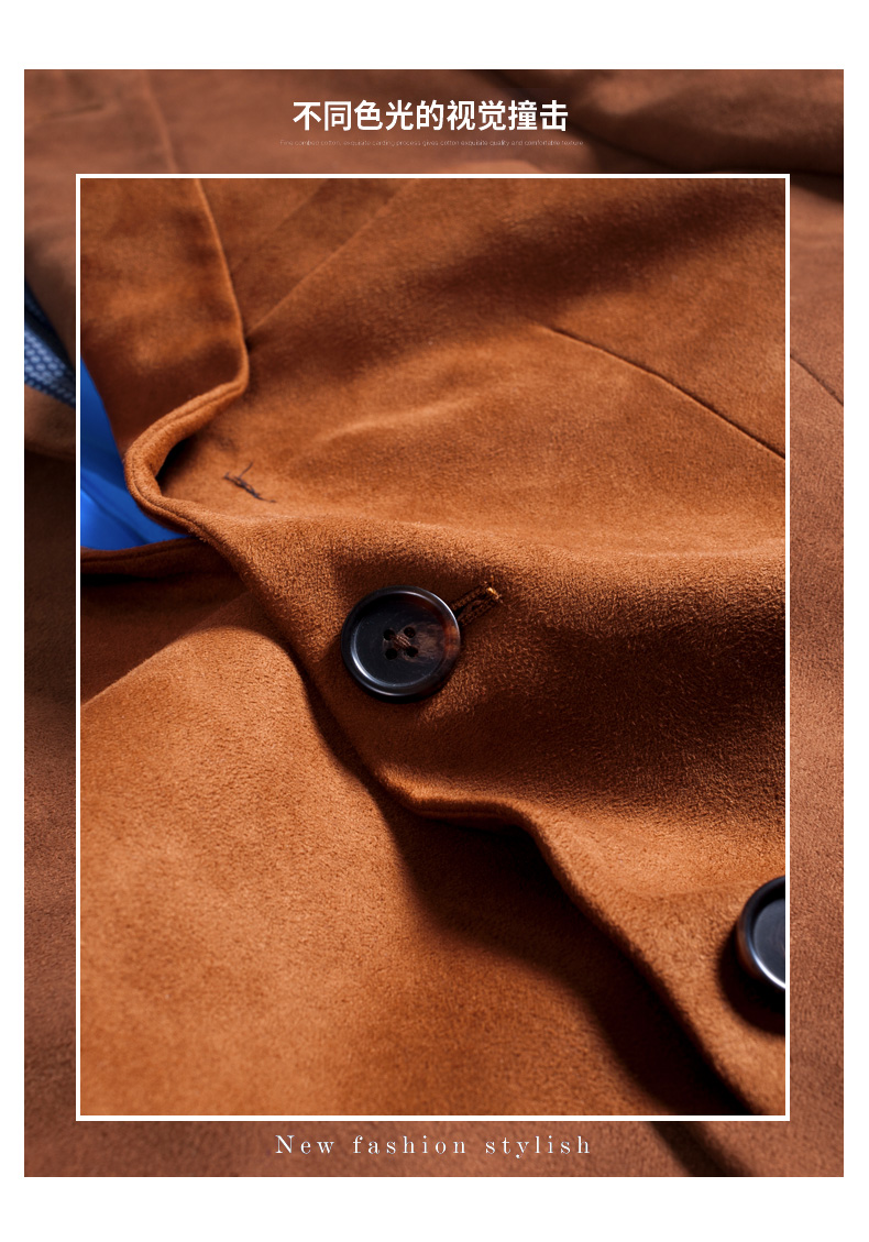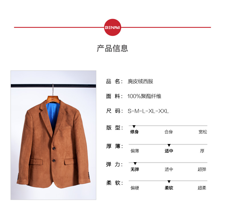 本米西服夹克,为30-40岁男性设计,面料为100%防风麂(ji 三声)皮绒,只选显年轻的驼色,休闲款式,修身版型,上身遮肚子显精神,有减龄5岁效果。是一款间距时尚和保暖的夹克。