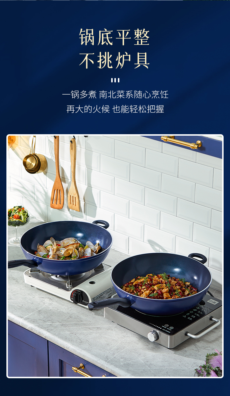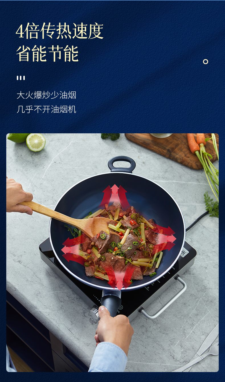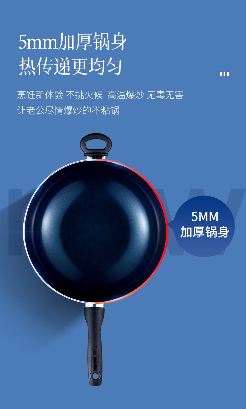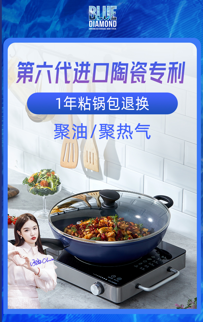 这款蓝钻Bluediamond 不粘陶瓷炒锅,使用第六口进口陶瓷专利技术,在陶瓷中加入了钻石成分,使得整体坚硬度提高了5倍,持久耐用。