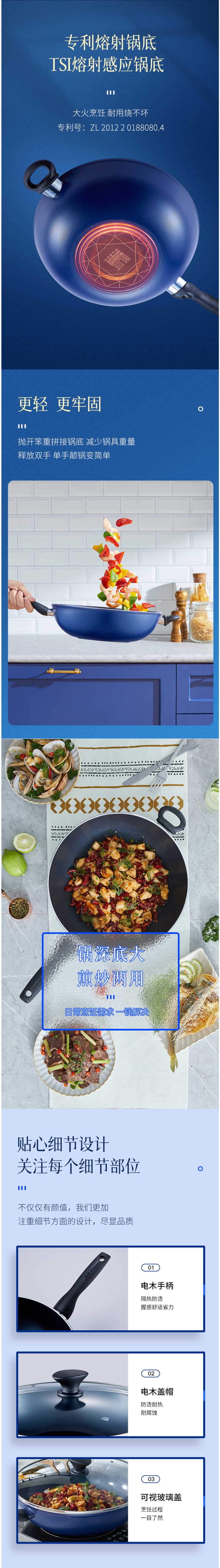 5mm加厚锅身,热传递更均匀。专利ISI熔射感应锅底,耐高温性强,锅底平整,不挑炉具。电木手柄隔热防烫,电木盖帽防烫耐热抗腐蚀。