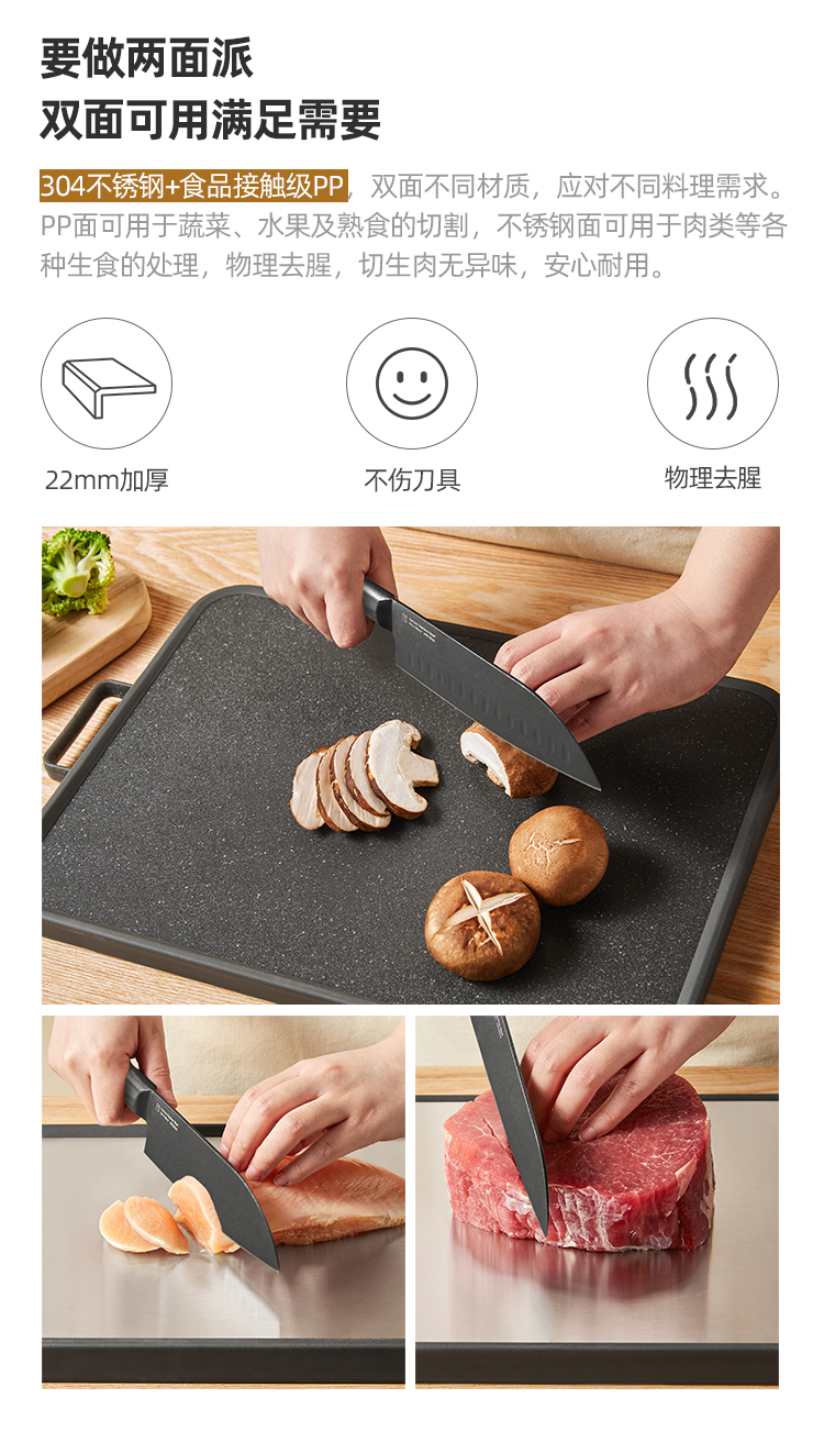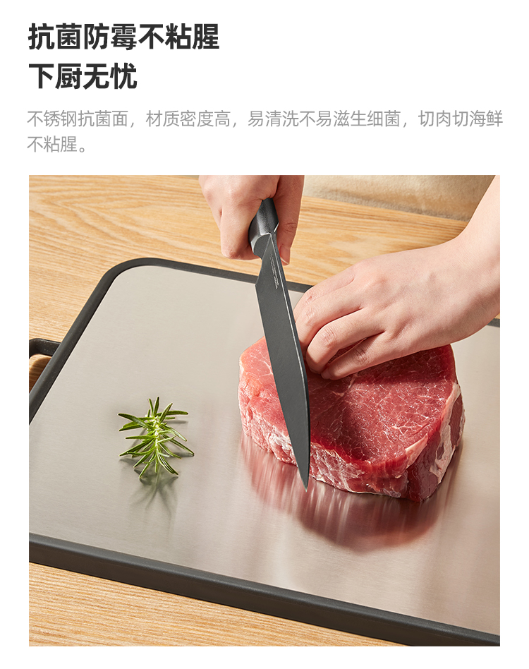 这款是第二代的加厚款,相比于初代,第一是变成了双面,正面304不锈钢、反面PP材质,中间加了一层木板材质,更厚更实用;第二是周边增加了一圈TPR橡胶,使菜板不与台面直接接触,更卫生,同时汁水不易外流。