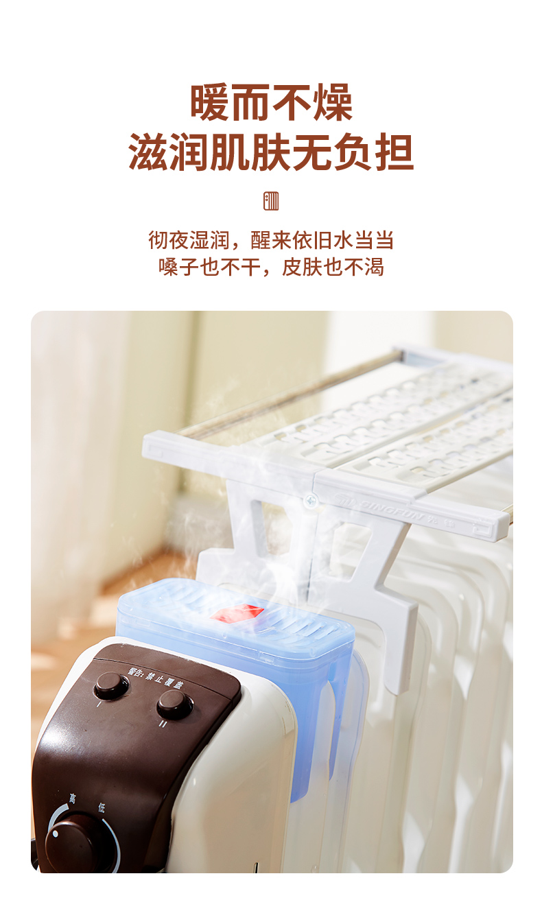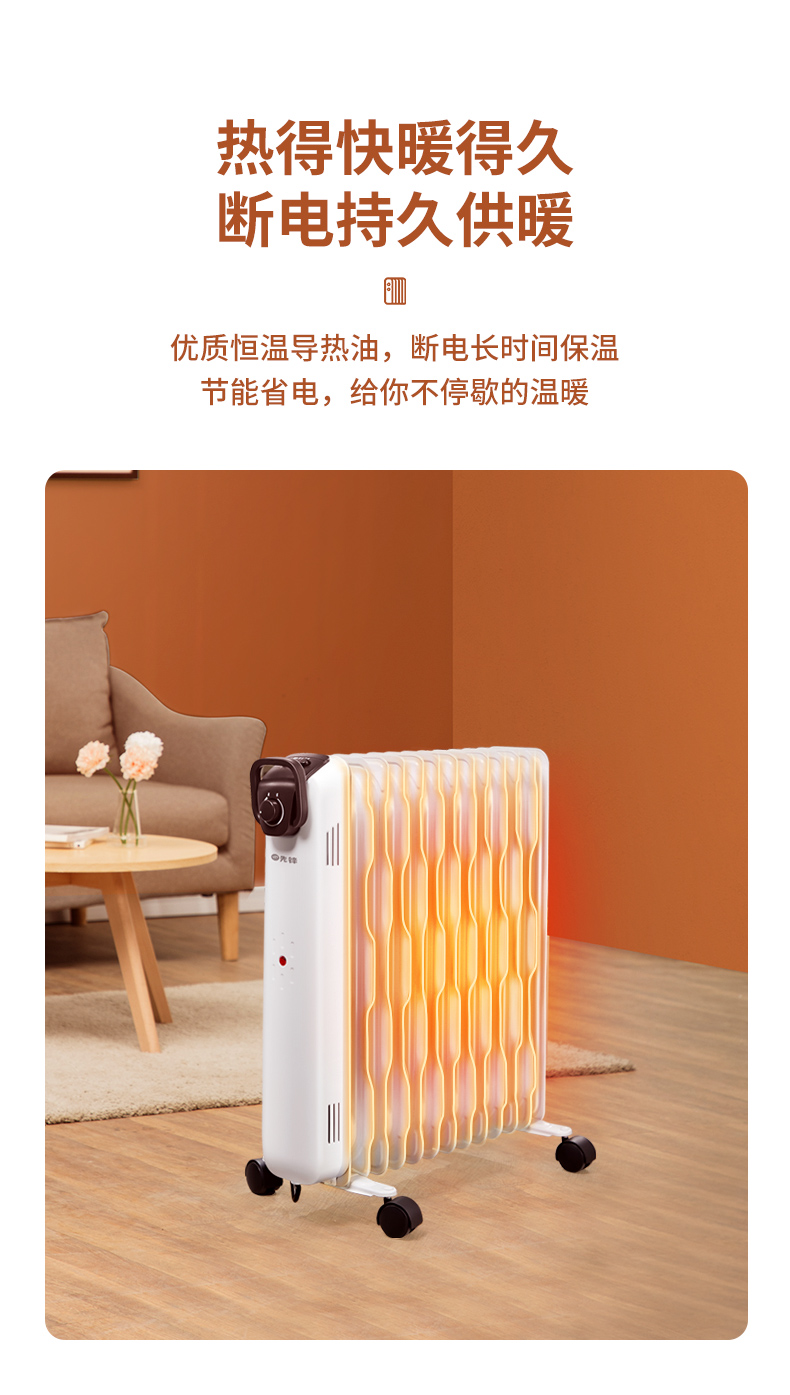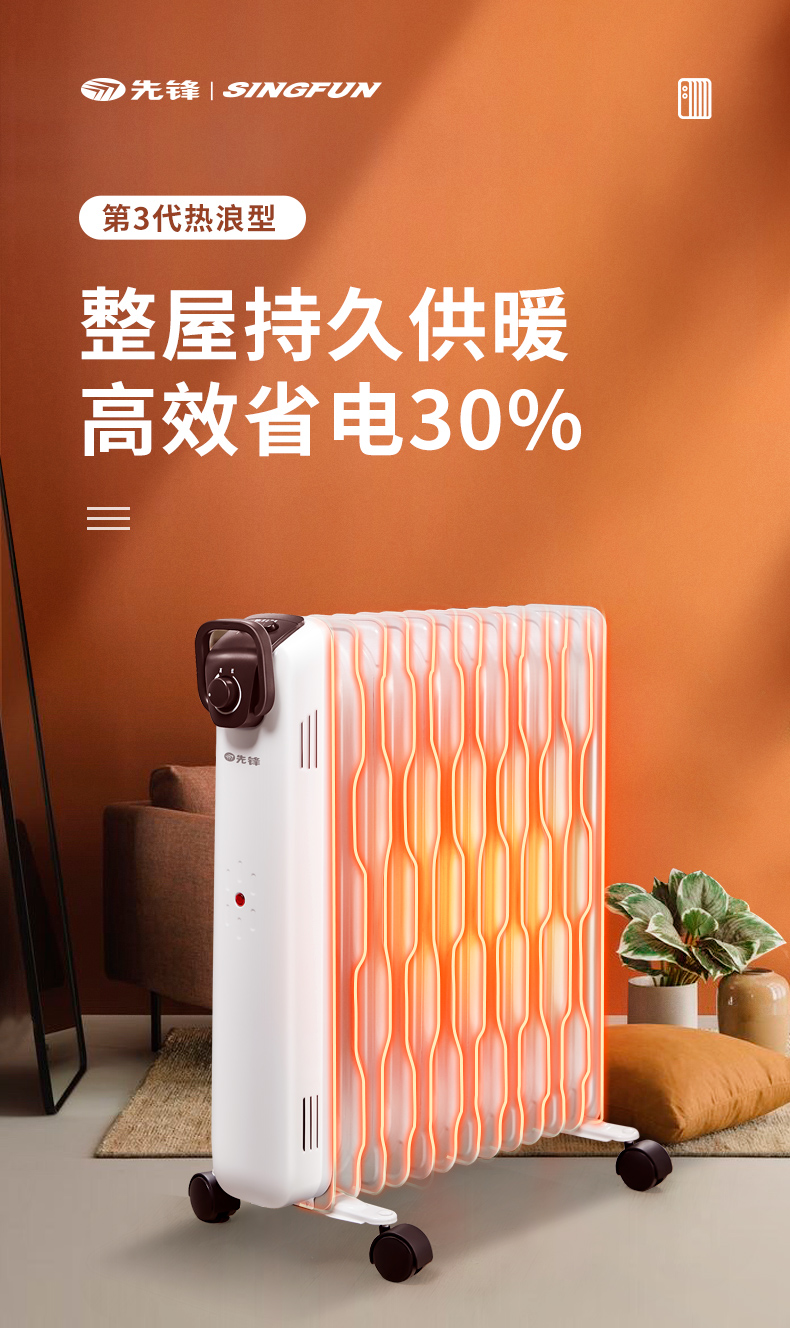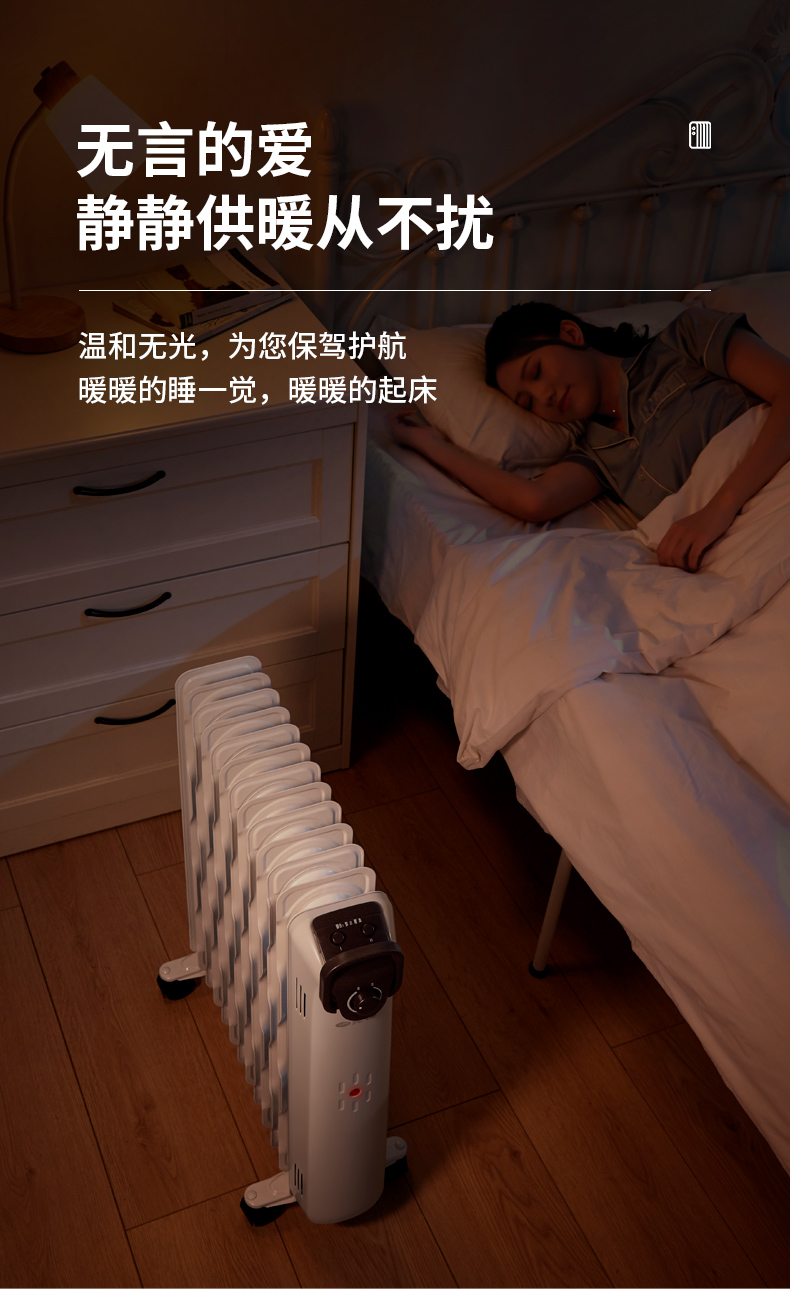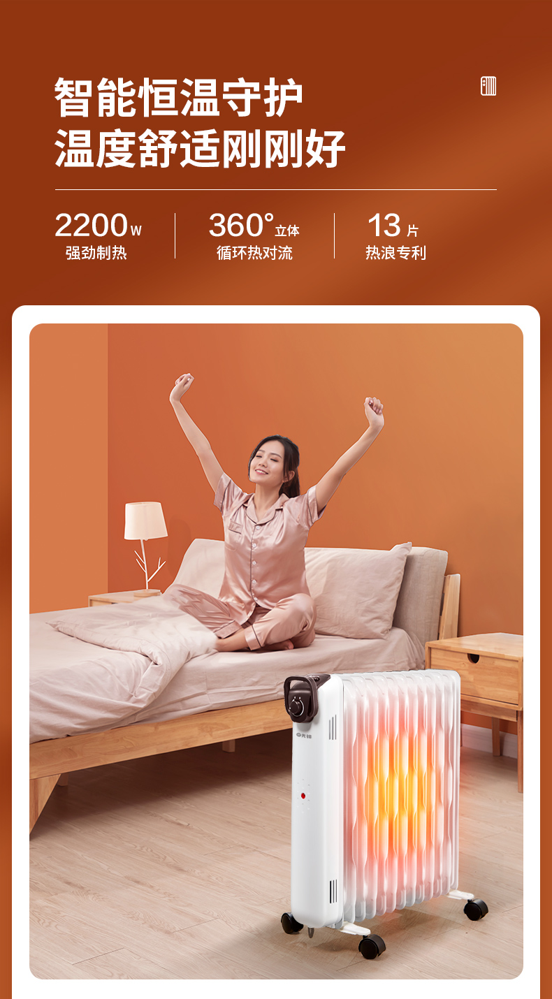 第三代技术热浪油汀。专利蜂窝电暖器片,13片油汀同时升温,仿水暖气片设计,加热后,导热油可快速贯穿整个散热片,持续储热损耗低,升温快,适用25-30㎡左右的房间。