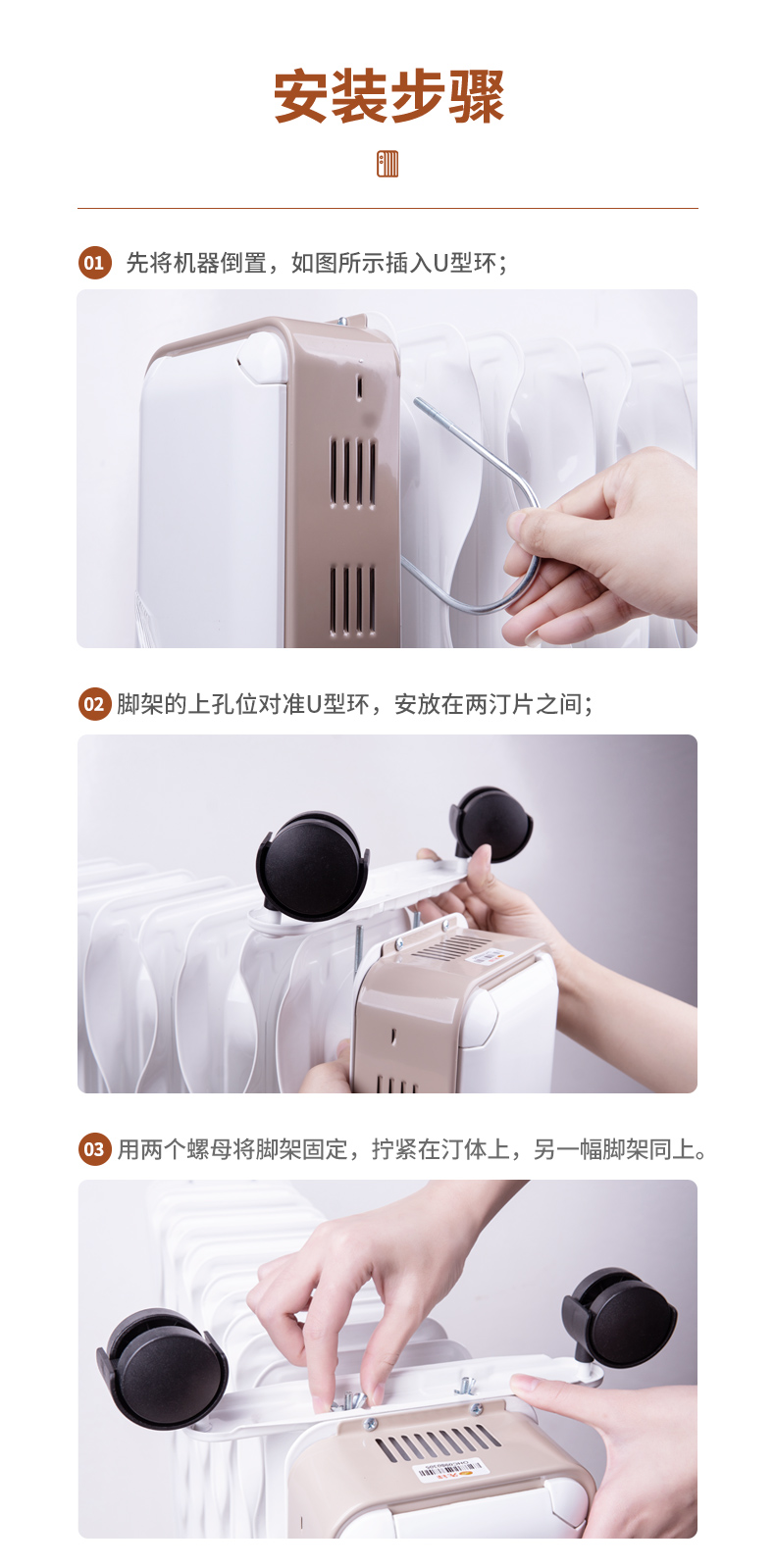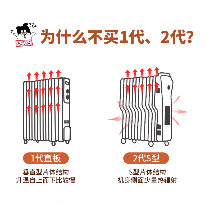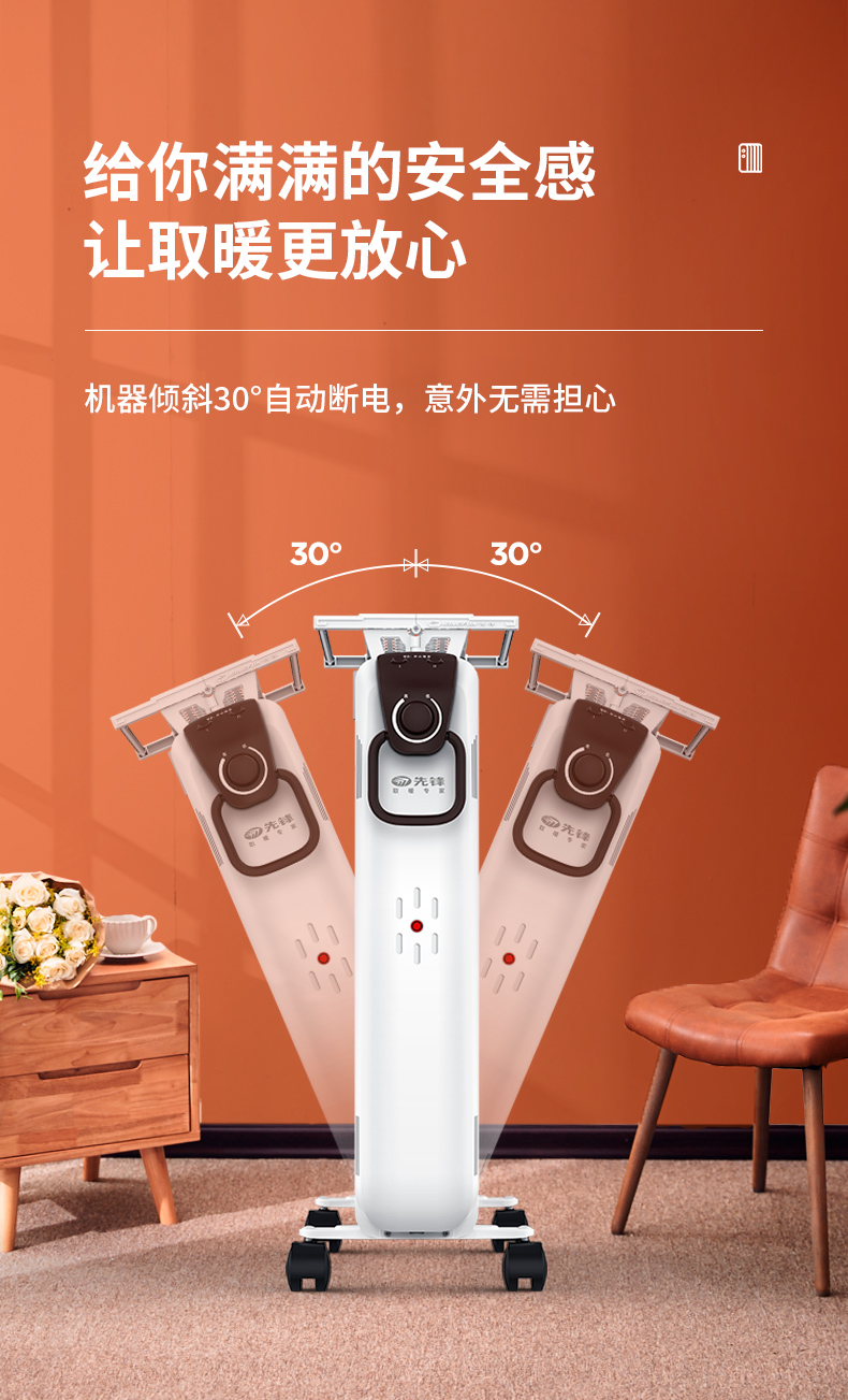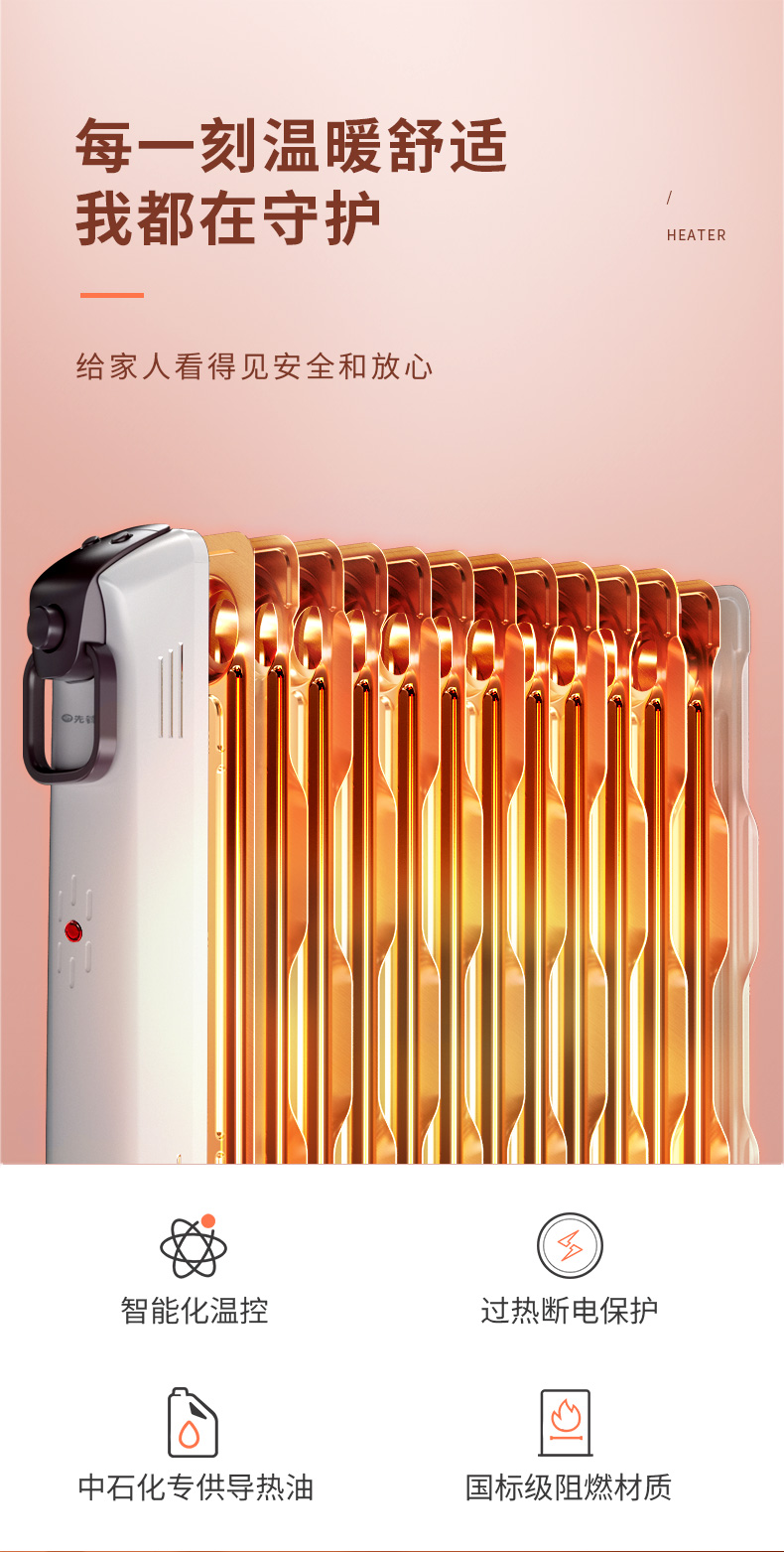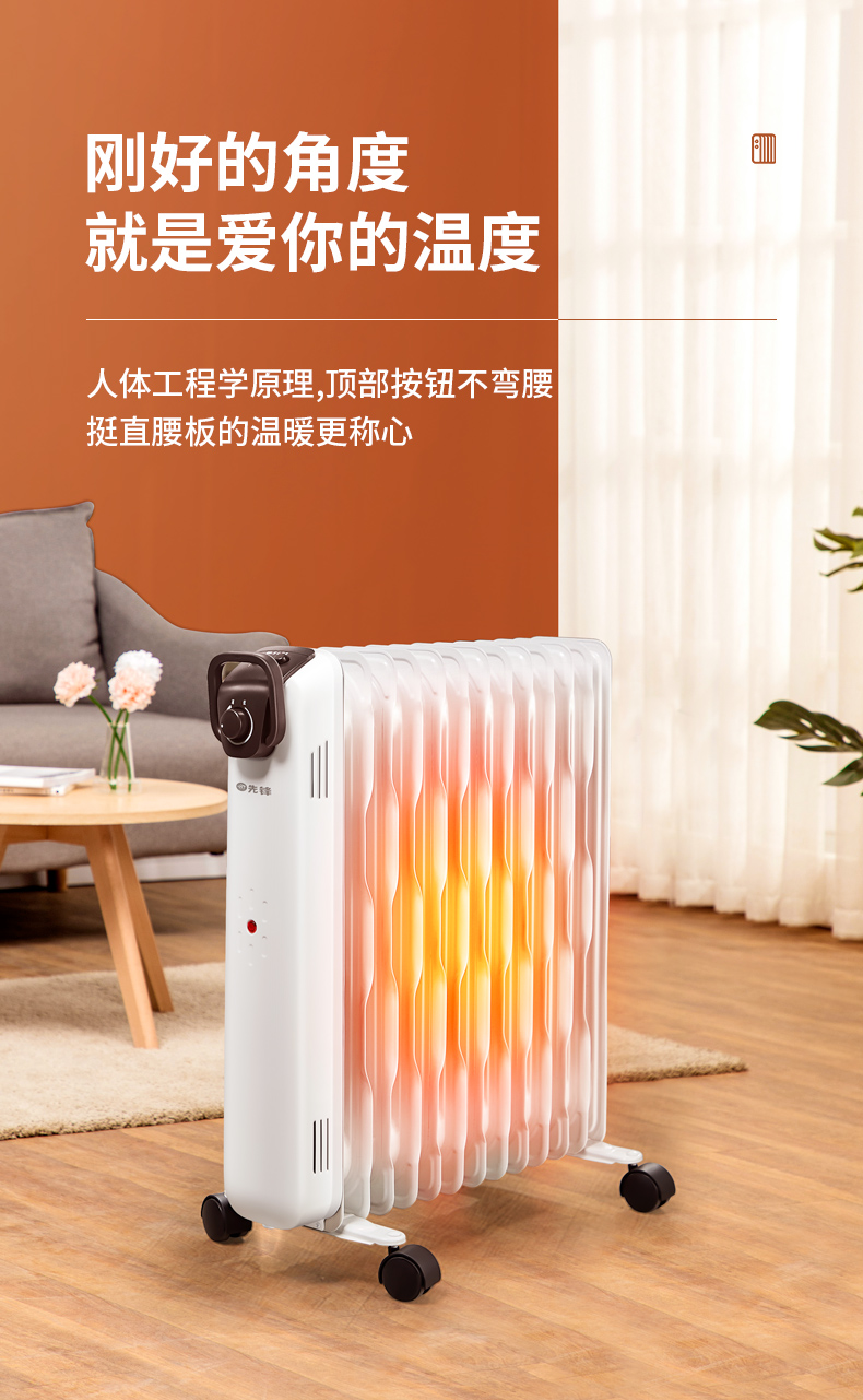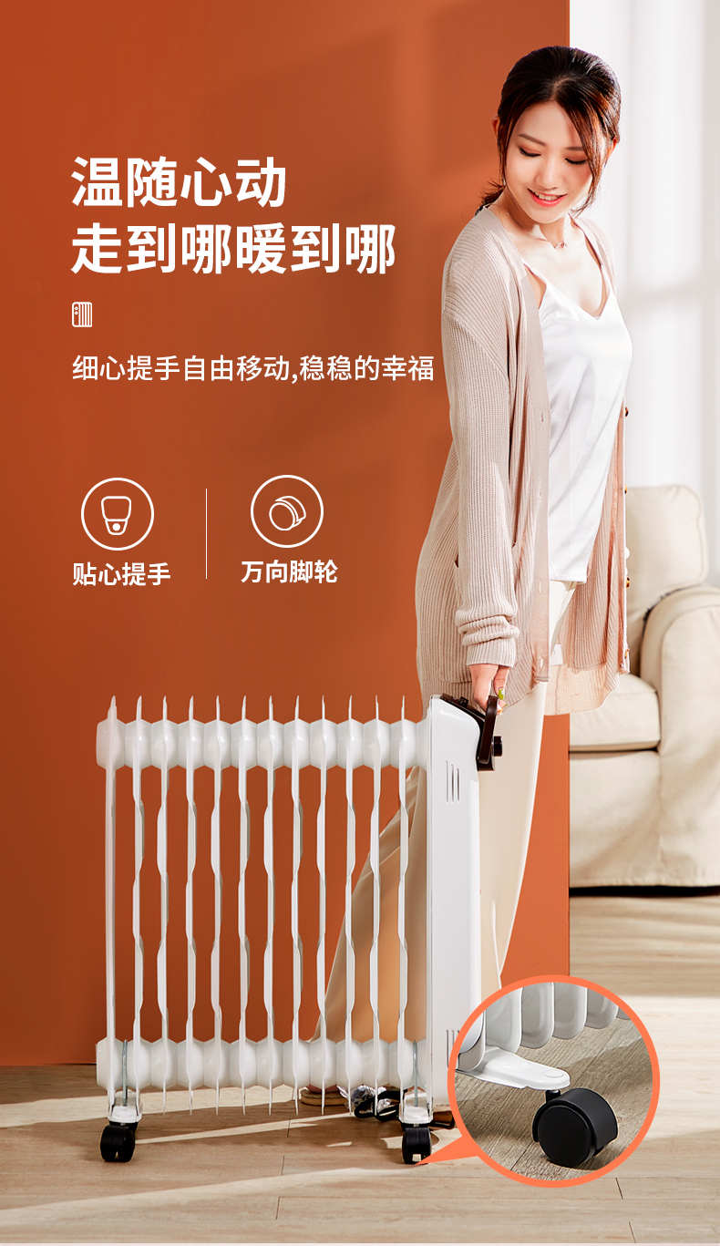 第三代技术热浪油汀。专利蜂窝电暖器片,13片油汀同时升温,仿水暖气片设计,加热后,导热油可快速贯穿整个散热片,持续储热损耗低,升温快,适用25-30㎡左右的房间。