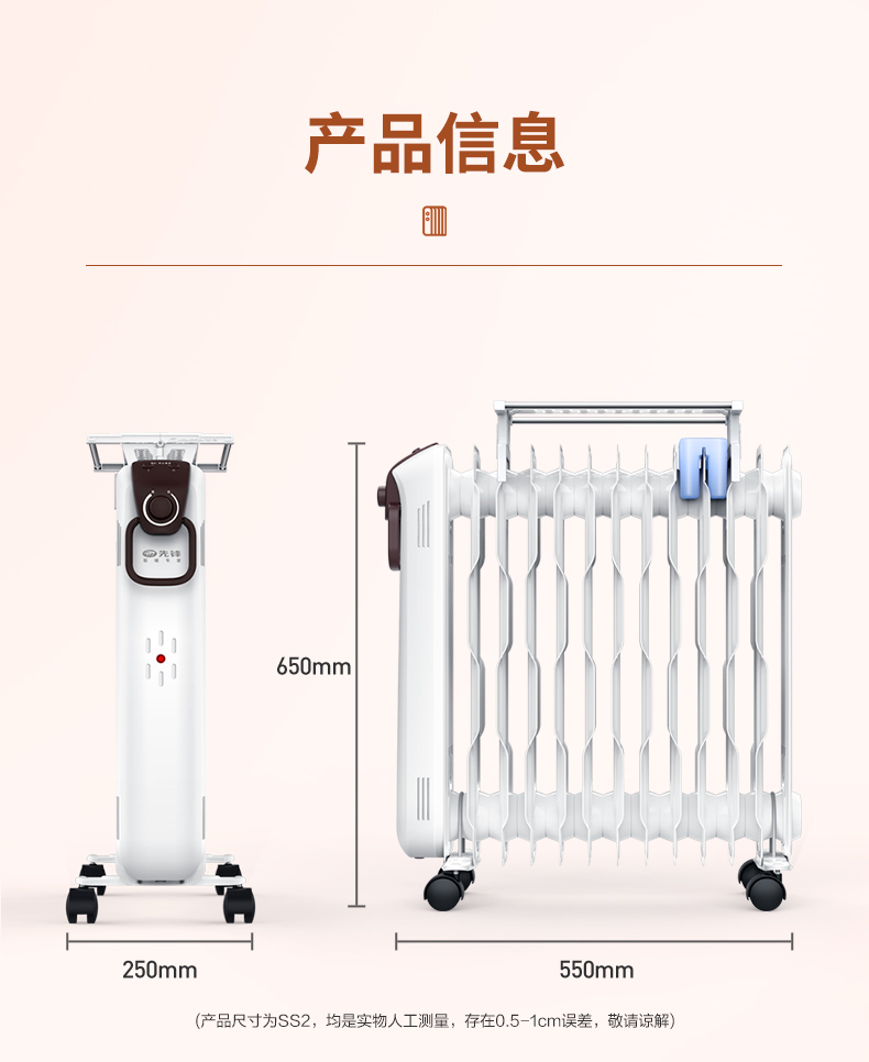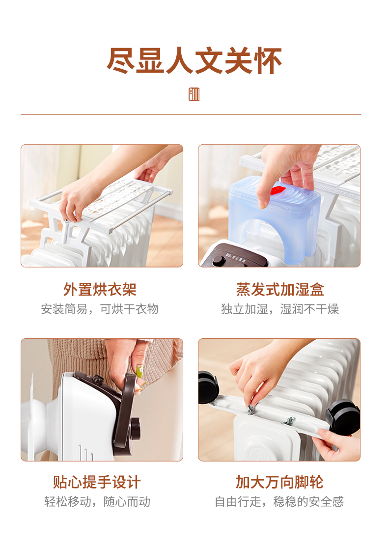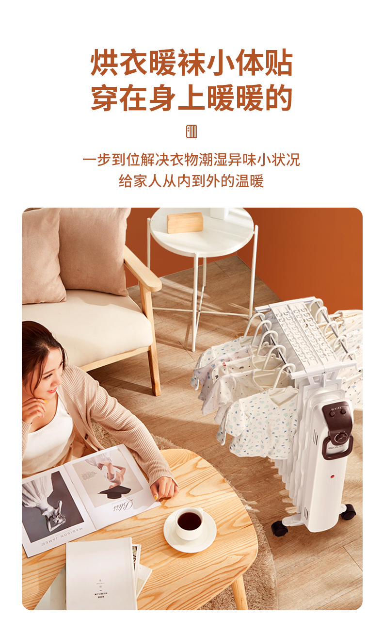 自带可折叠的烘衣架,可烘衣服、烘秋裤、烘袜子,烘毛巾;有多种安全保护,防烫后壳,过热保护,倾倒断电,防冻结保护,无光无辐射,防火用料;自带轮子设计,随时移动更加方便。