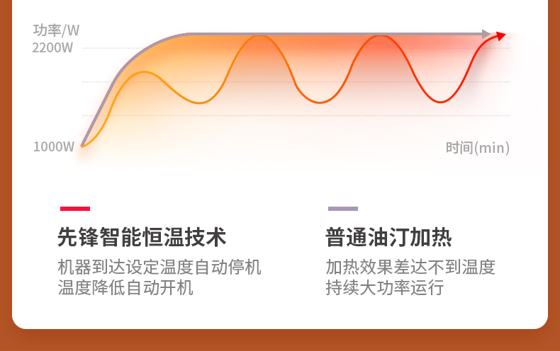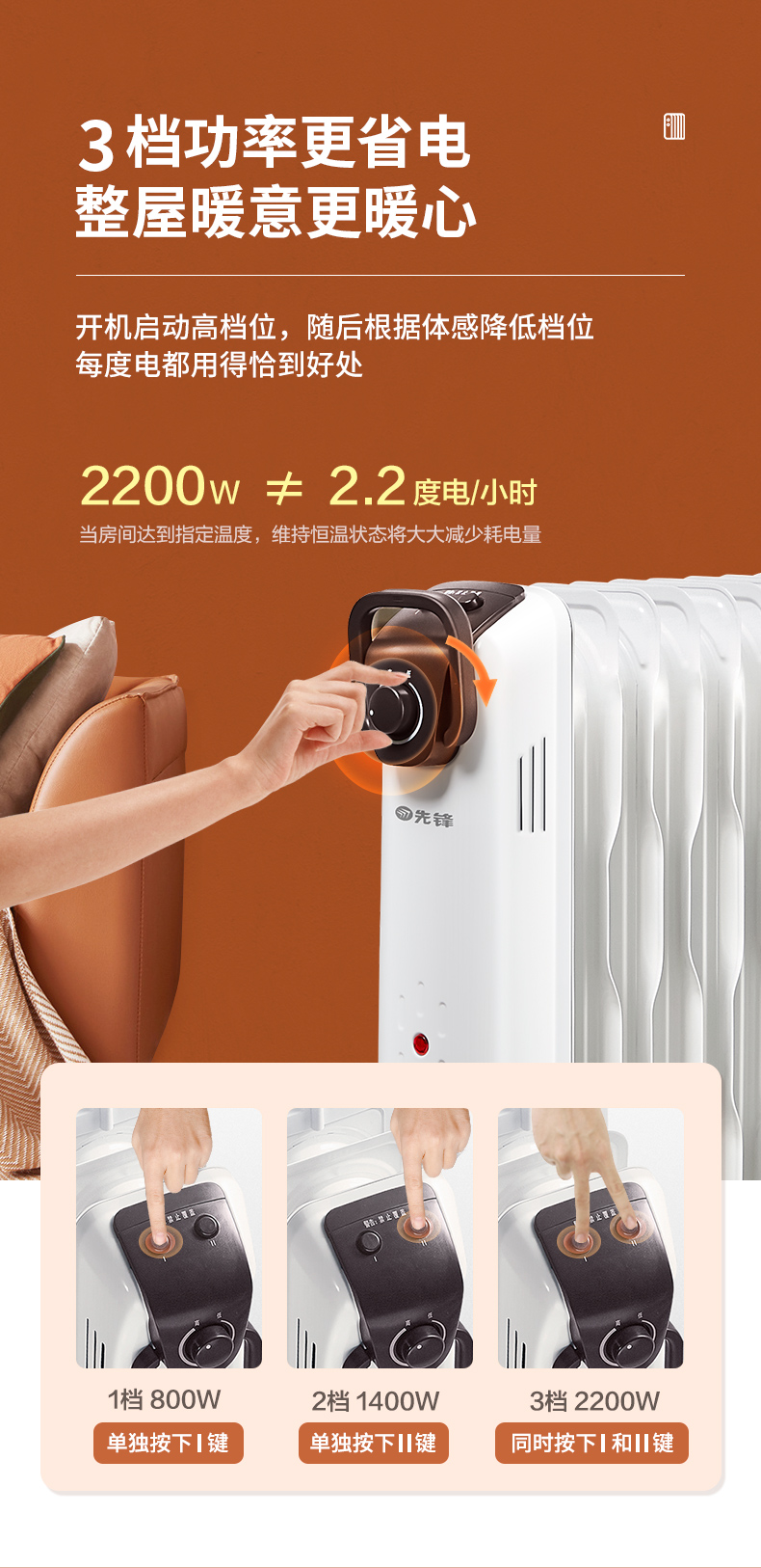 2200W大功率,在同样取暖效果的情况下,电热油汀的功率越大,效果越好。三档调节,低档—800W,中档—1400W,高档—2200W,配合智能控温及持久储热的特点,将空间加热到预设效果后立即停止工作,相比于一直开着的小功率取暖器更省电。