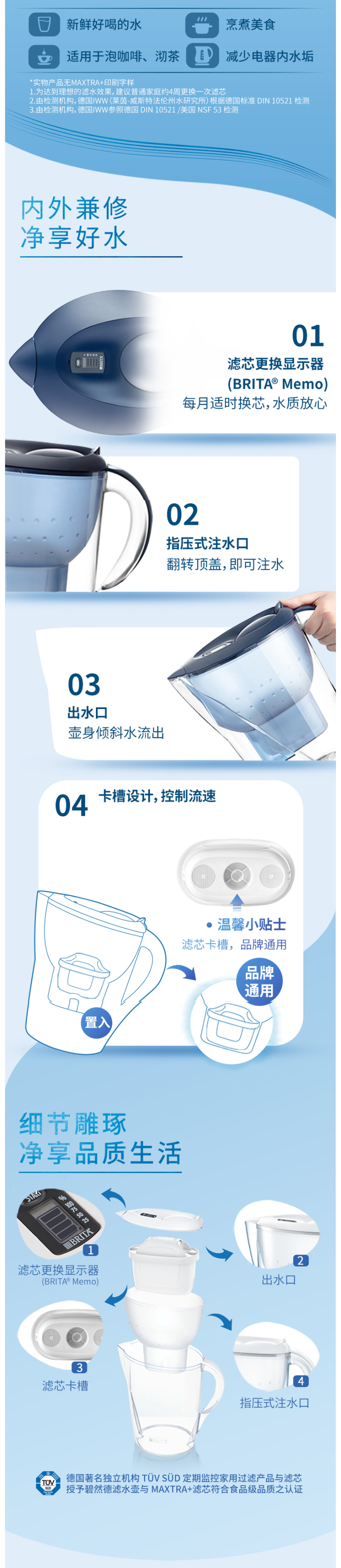 滤芯方面,德国原装进口的Maxtra+,比传统的一代滤芯在过滤能力方面增加了20%,还改良了MicroFlow Technology 微流控技术,使水的味道比以往更好。滤芯中所含的活性炭,能有效过滤水中的重金属、水碱、杀虫剂、有机杂质、氯气和异味。
