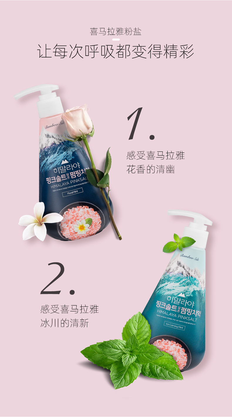 这款竹盐LG 喜马拉雅粉盐派缤 按压牙膏,韩国原装进口,采用按压式设计,粘稠剂含量低,所以牙膏偏稀,更方便挤出;刷牙时无需刻意沾水,直接刷牙也能快速溶解, 刷牙时泡沫低,因为添加发泡剂很少,减少对牙龈和敏感牙齿的刺激,口感微咸。