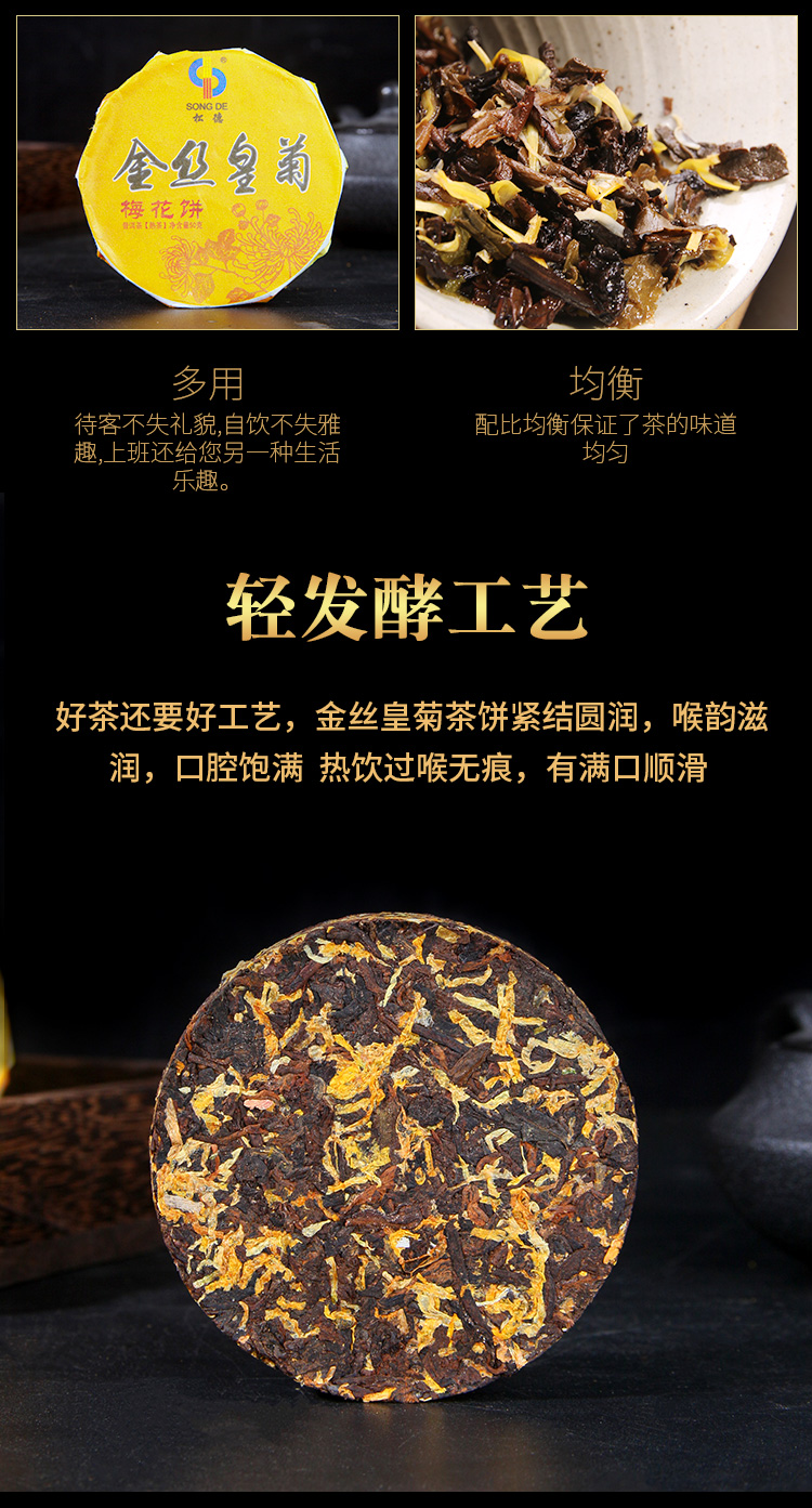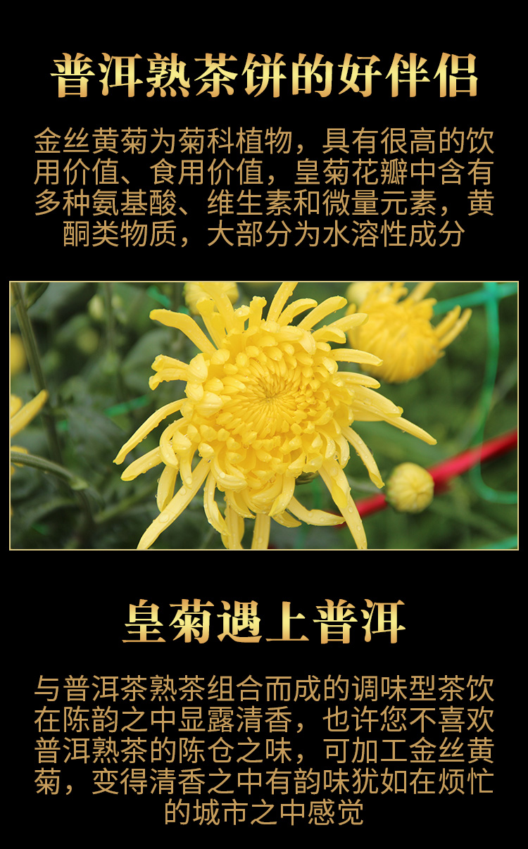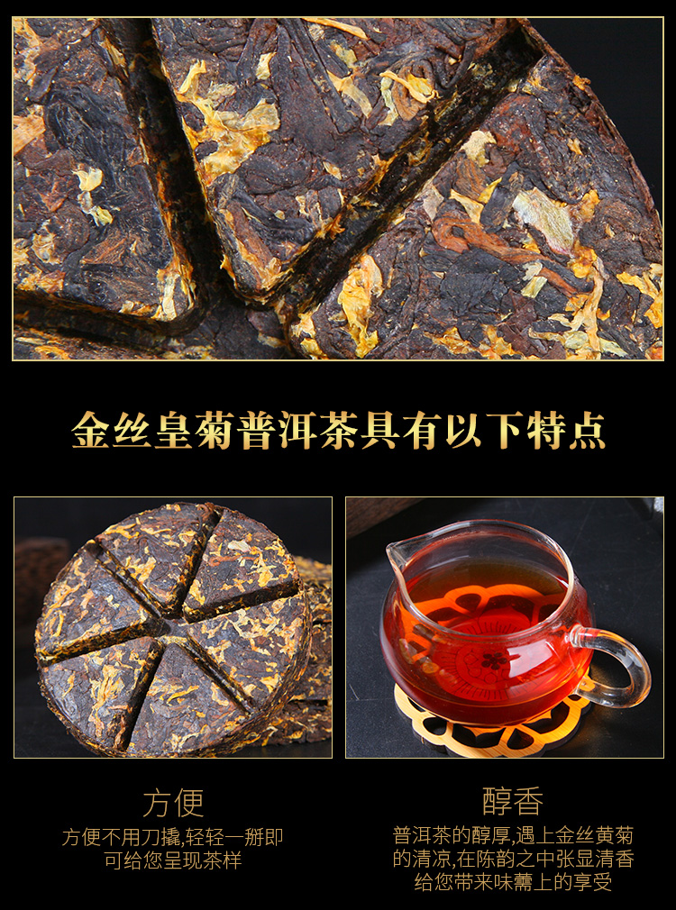 甄选勐海古树普洱、金丝皇菊为原料,轻发酵工艺,茶饼圆润端正,松紧适度,用料均匀,茶饼凹槽设计,轻松掰开不易碎,无需撬茶更轻松,茶汤金黄透亮,入口浓厚回甘,肥壮匀净,不管是办公自饮都非常不错。