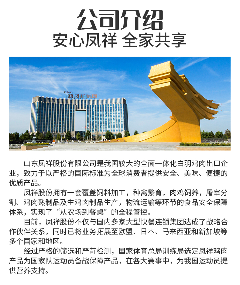 凤祥食品是肉鸡行业中产业链完整、规模较大的生产加工出口企业之一,产品远销欧盟、日本、韩国、马来西亚等20个国家和地区,凤祥食品是肯德基、麦当劳等连锁集团的战略供应商,今年5月16日,凤翔的鸡肉制品还成为了国家队运动员的备战保障产品。
