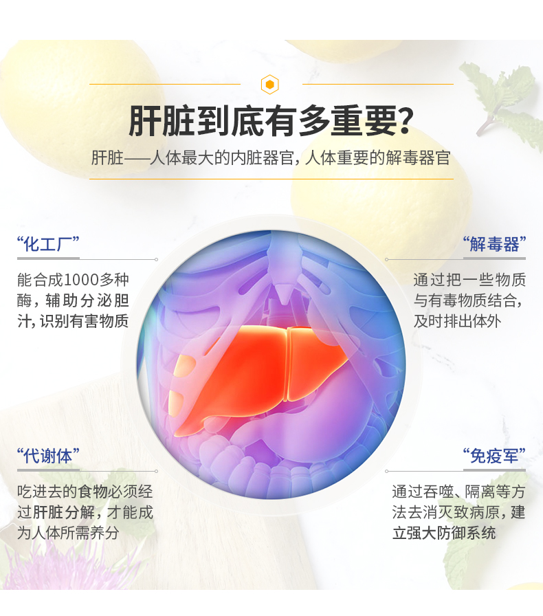 奶蓟草是传统的治肝良药,在欧洲已有千年的应用史,同时,护肝片还富含黄酮和胆碱,能激活肝脏蛋白的再生,利用抗氧化作用保护肝细胞,修复被酒精等负面因子所带来的损伤,有助于促进肝脏中的脂肪代谢,更顺畅排出体内积压毒素,维系肝脏的正常运作,起到预防肝炎、脂肪肝等肝脏疾病的作用。