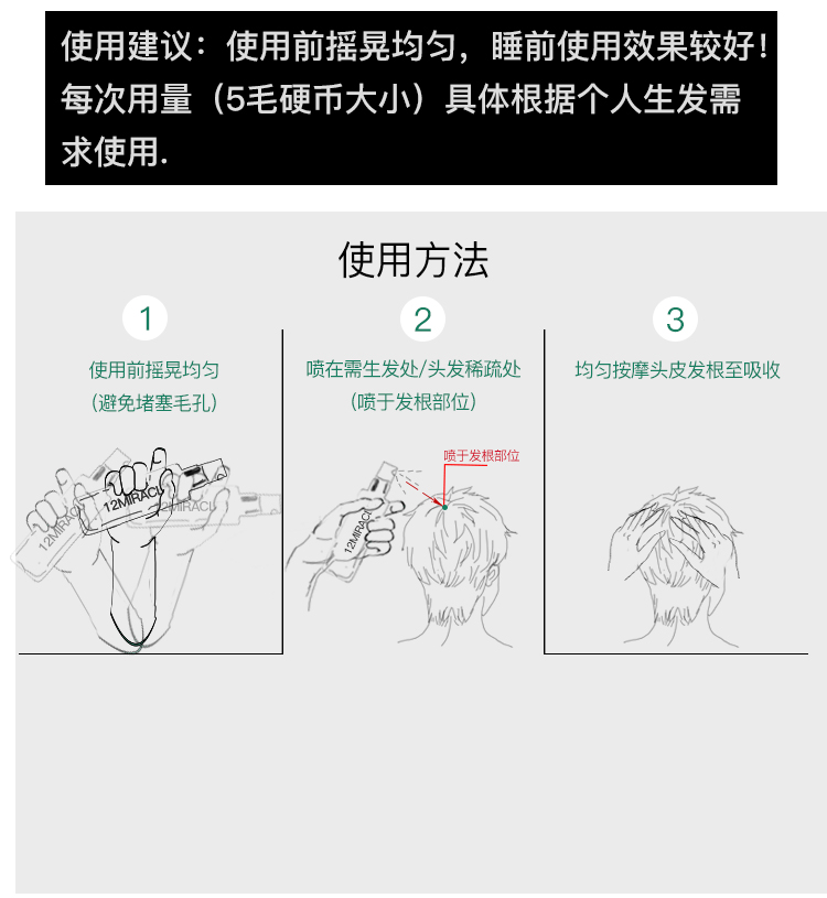 规格是135ml,每日使用1次,每次手拇指盖大小的量即可,置于掌心,均与涂抹至头发的稀疏发根处,轻盈按摩头皮发根至吸收。