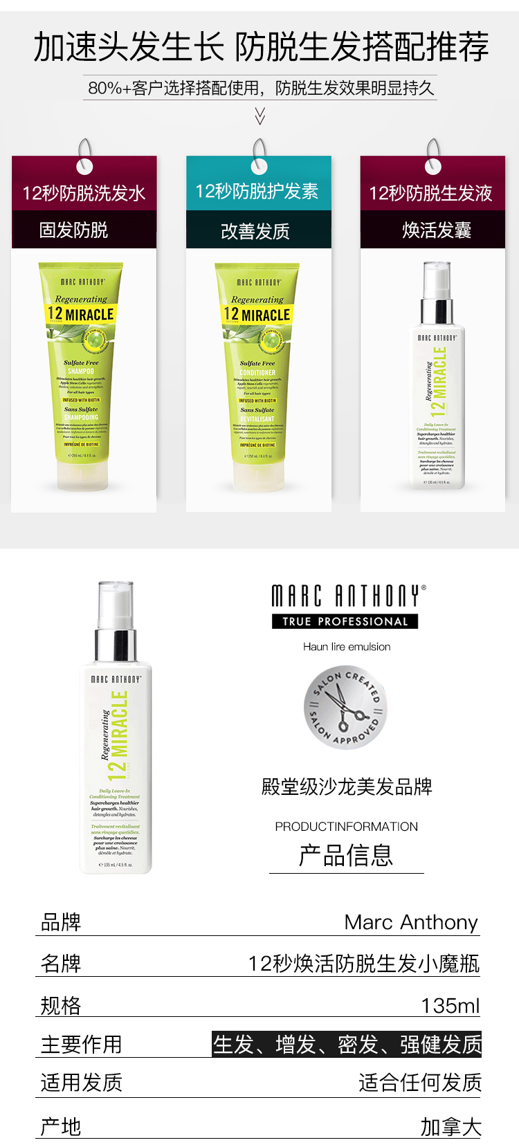 这款Marc Anthony 防脱发 生发增发增长液,加拿大原装进口,主要作用是焕活毛囊细胞,促进头发再生长,强韧发质防止头发断裂,可激活发囊细胞、平衡头皮油脂、养发育发、固发防脱、恢复头发光泽。