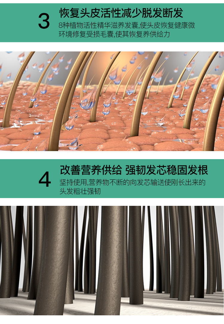 固发防脱,植物活动精华滋养毛囊,营养物质不断向发芯书宋,头发变得粗壮强韧;