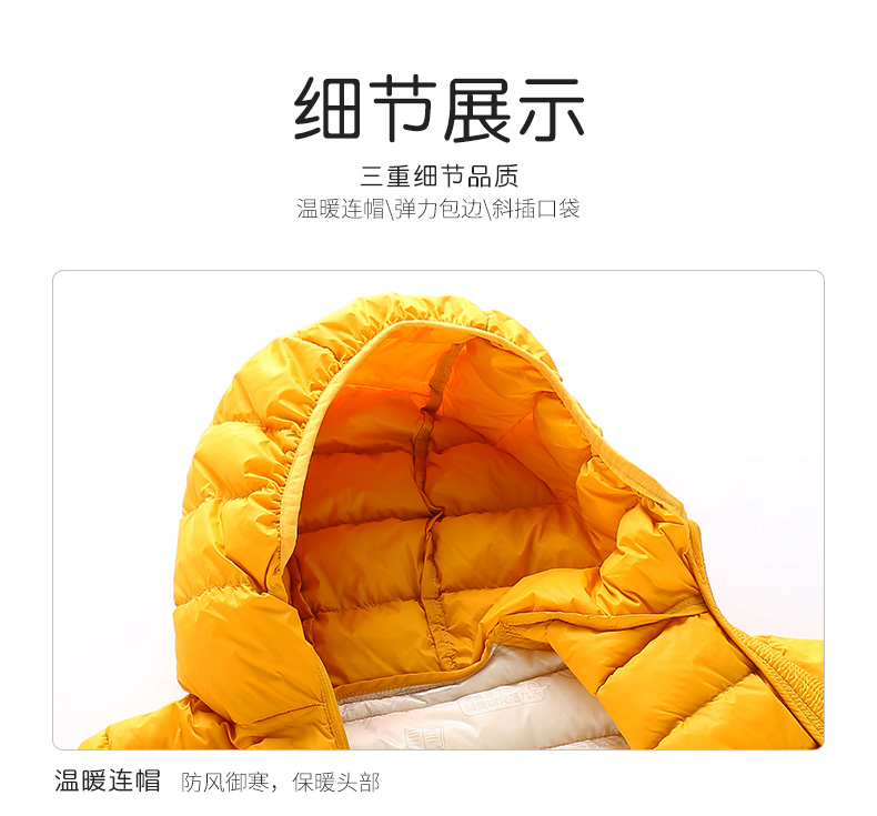 这款羽绒服采用20D/400T消光尼丝纺面料,面料轻薄透气,高密度锁温防钻绒,同时结实耐磨,内充90白鸭绒,高蓬松度清洁度,轻柔锁温,合体版型连帽设计,帽子袖口弹力包边,简单大方,防风保暖~