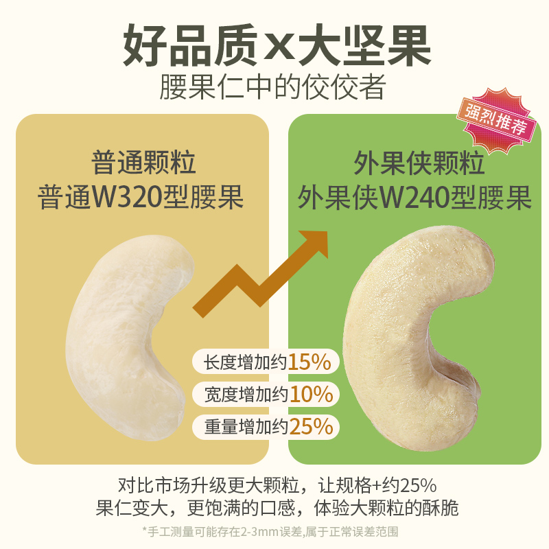 大小一般用阿拉伯数字来表示:每磅有多少粒,数字越小的腰果越大,但也不是死规定,可以上下浮动约20粒。