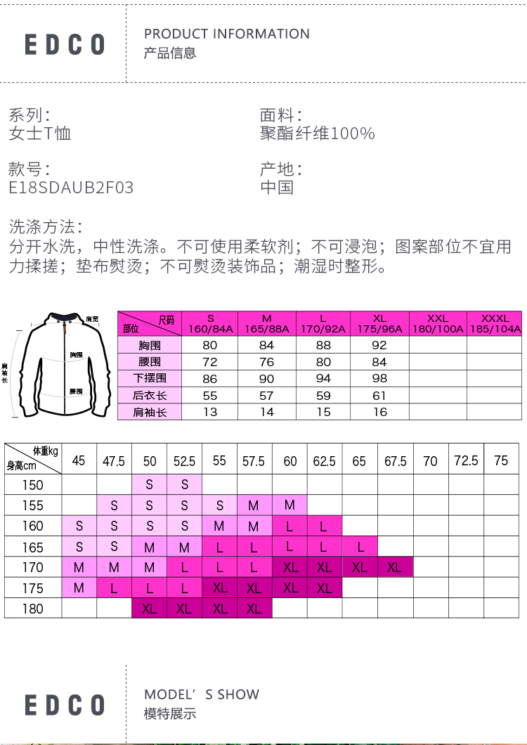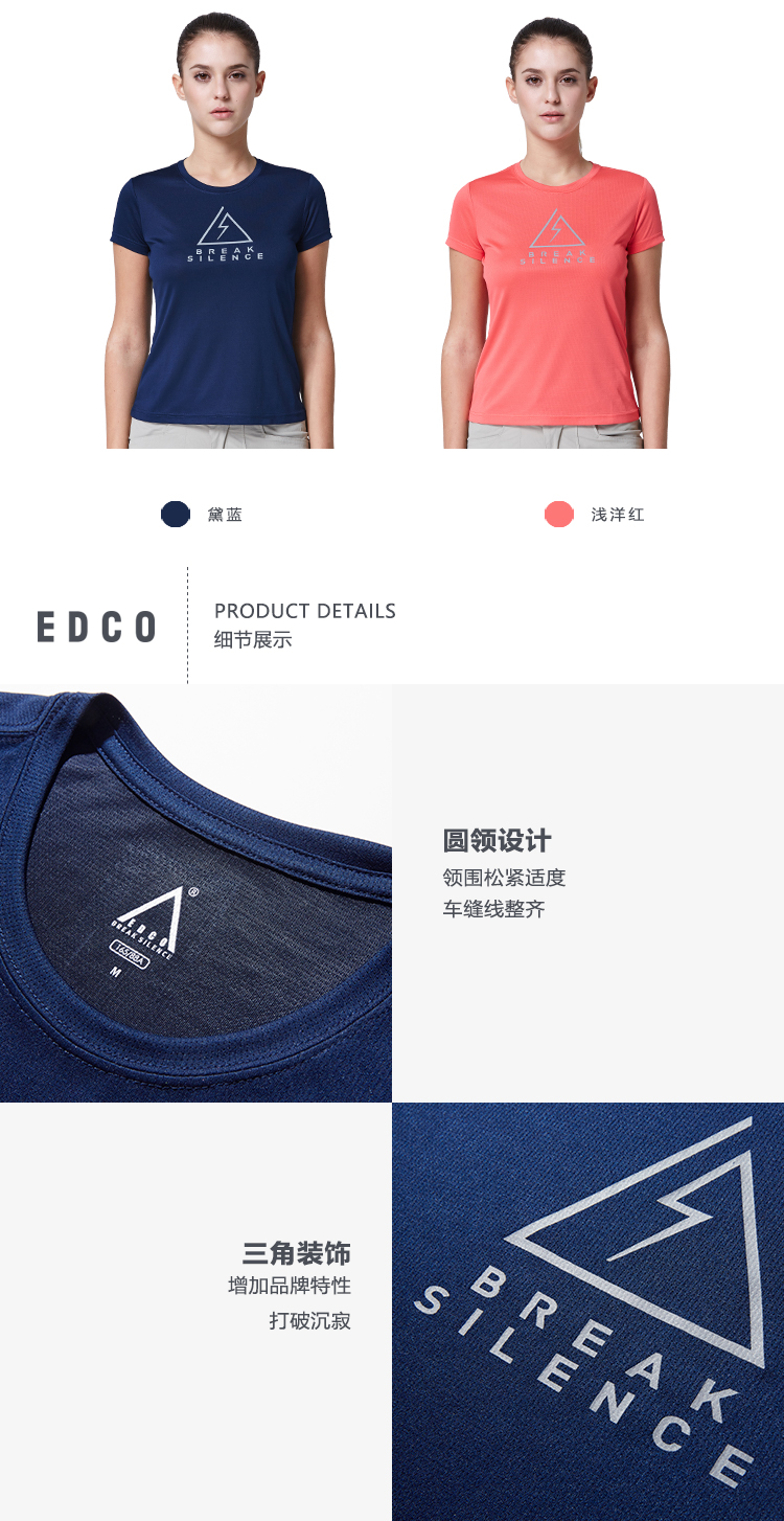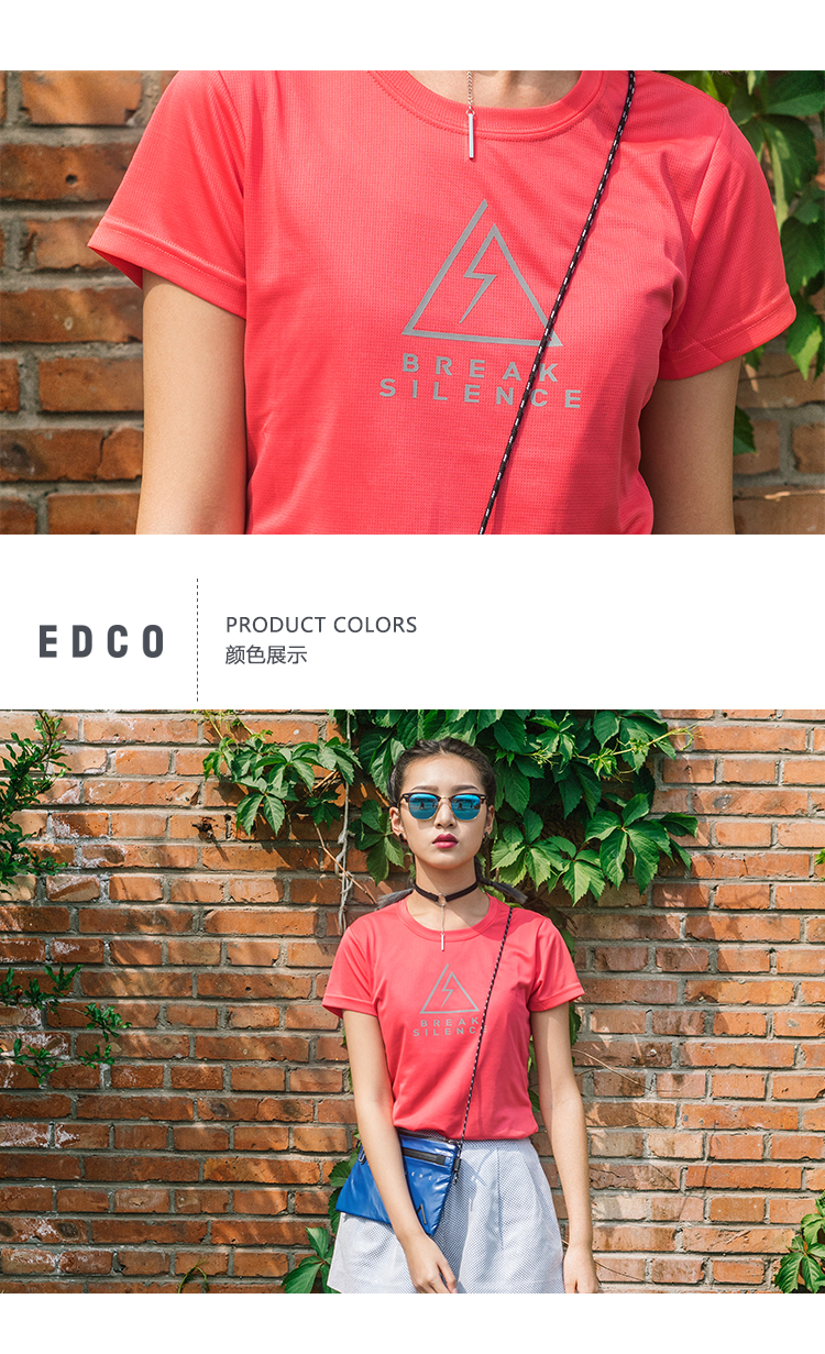 这款艾德克EDCO女运动T恤,使用100%聚酯纤维面料成细腻针织网纱状,能加快体表汗气排出,速干透气不闷热,拥有微弹性和一定的延展性。修身版型,无感标签,肩膀双重车线细密整齐。