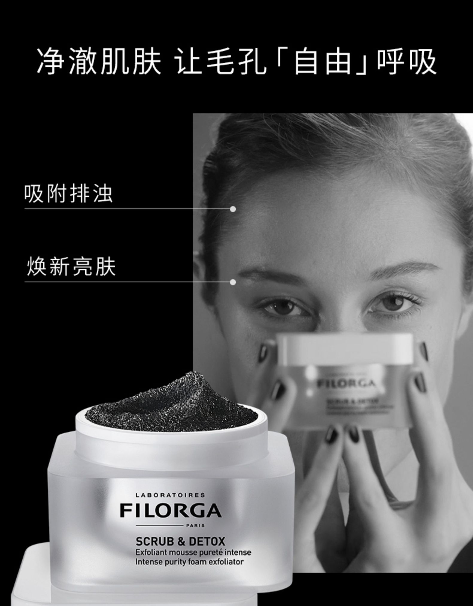 这款FILORGA 菲洛嘉 清润净透磨砂面膜,菲洛嘉将核心成分NCEF [50种活性成分+透明质酸]结合微球运载技术,渗入肌肤各个层次,逐层释放活肤物质。无需借助针剂,也可以滋养深层肌肤,对抗皱纹、松弛等肌肤岁月问题,焕活肌底“芯”能量。火山岩微球粒子+木瓜蛋白酶,双重净除老废角质,平滑细腻肤质。活性炭+百香果多酚,双重净澈吸附杂质,净透亮泽肌肤。烟酰胺+维生素E,保湿呵护润泽美肌,提升自身抵御力。空气感微球质地,柔软黑色泡沫质地,通过涡流混合吸收性聚合物微珠,深澈吸附卓效保湿,肌肤倍感温和舒适。