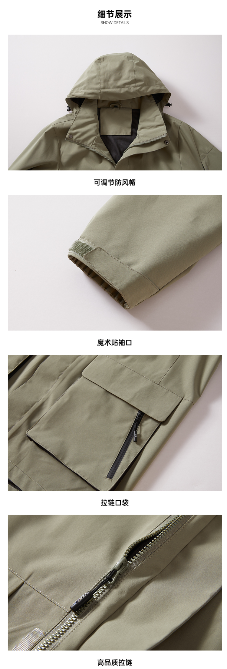 在款式上,合身版型,经典户外风设计,加大加宽的头盔式防风帽,搭配半高领,能很好的防风不漏风,皮瓣口袋、魔术贴袖口、双重门襟保暖更防风。