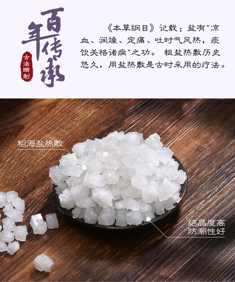由于盐的比热大,加热时吸收热量多,因而热敷时具有散热慢、温度持久的特点。海盐中药热敷疗法还能使体表温度升高,皮下组织舒展,痉挛的毛细血管松弛、扩张,血流加快,新陈谢加速,进而促进人体组织生理功能的恢复。