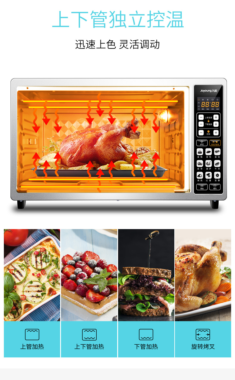 上下管能独立控温,上管最高220℃、下管最高180℃。上火高/下火低,适合饼干类,酥脆松香;上火低/下火高,适合肉类,下层香脆;上下同温,适合面包类,烤色一致;