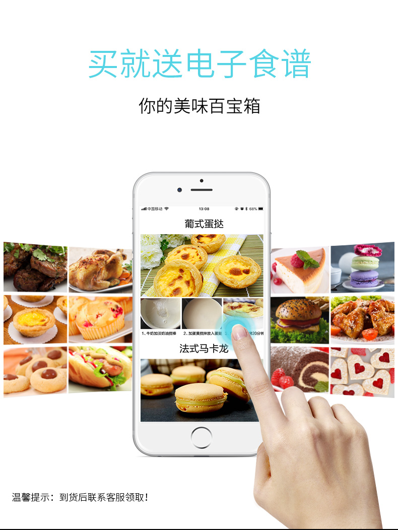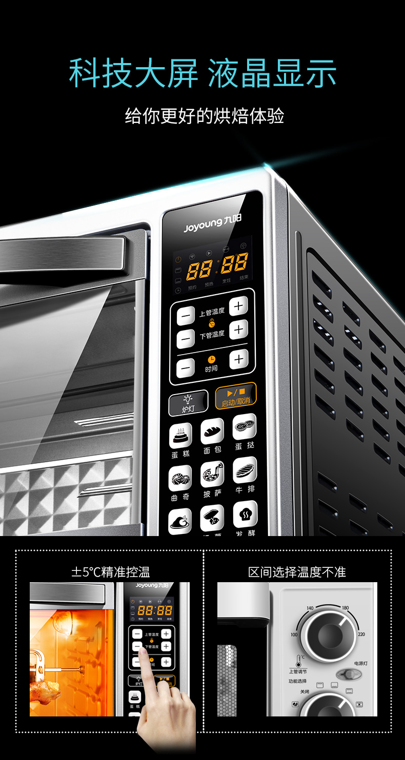 12道电子菜单,无需设置温度、时间,智能一键烘焙,大大提高了操作的便捷性;微电脑系统能准确操控温度,薄膜按键,在LED显示屏上清晰显示温度、时间;70-230℃的控温范围,可随意调节,满足不同食物的需求。