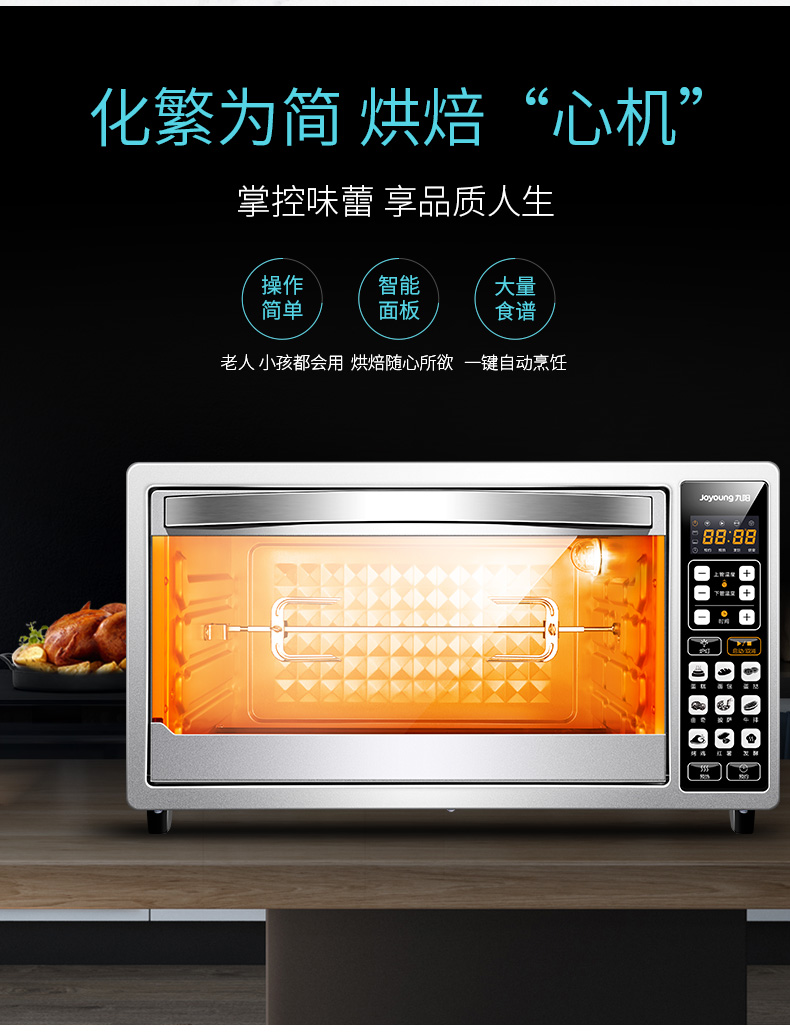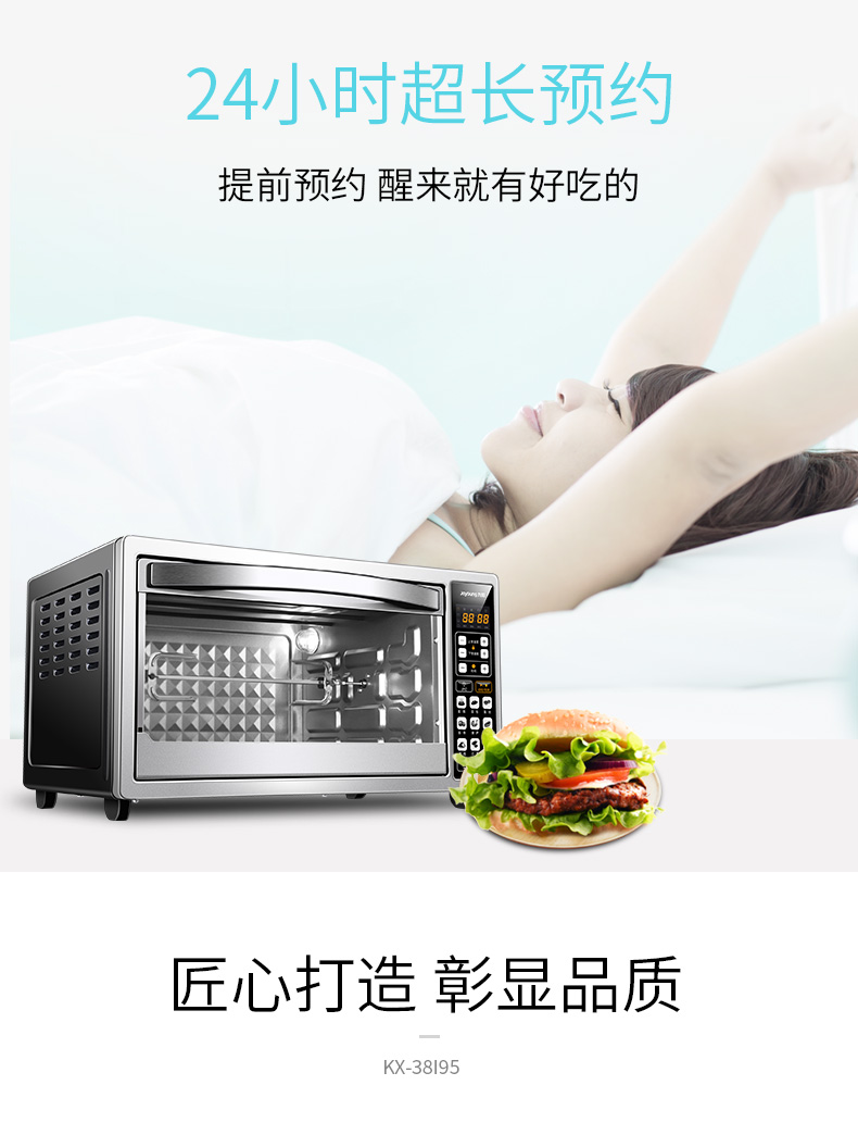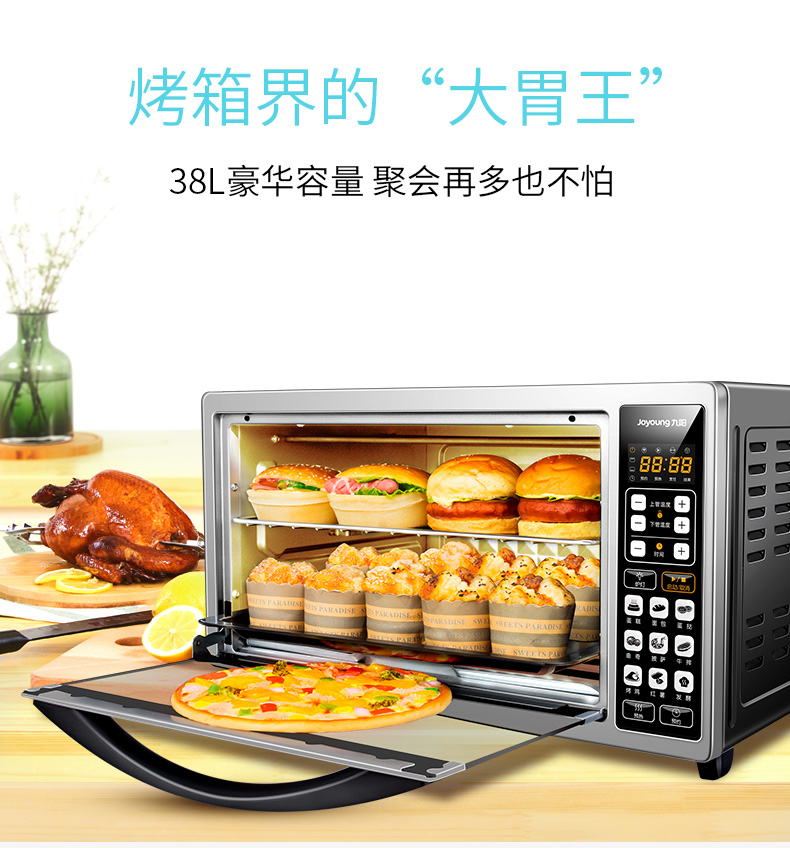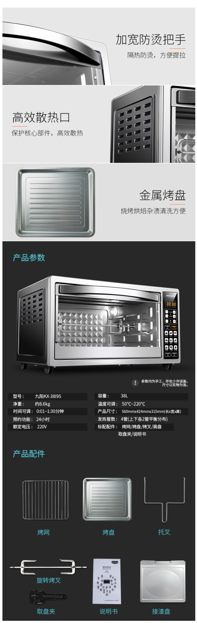 这款九阳 KX-38I95电烤箱,容量是38L(可烤12寸披萨),功率为1850W,上下独立控温,最高温度220℃。全密闭机身,不像平常低价烤箱那一层薄铁皮,规格是560*424*315mm。