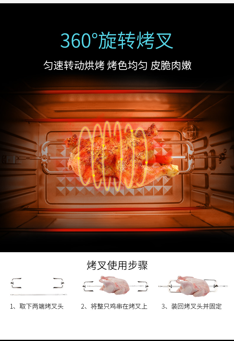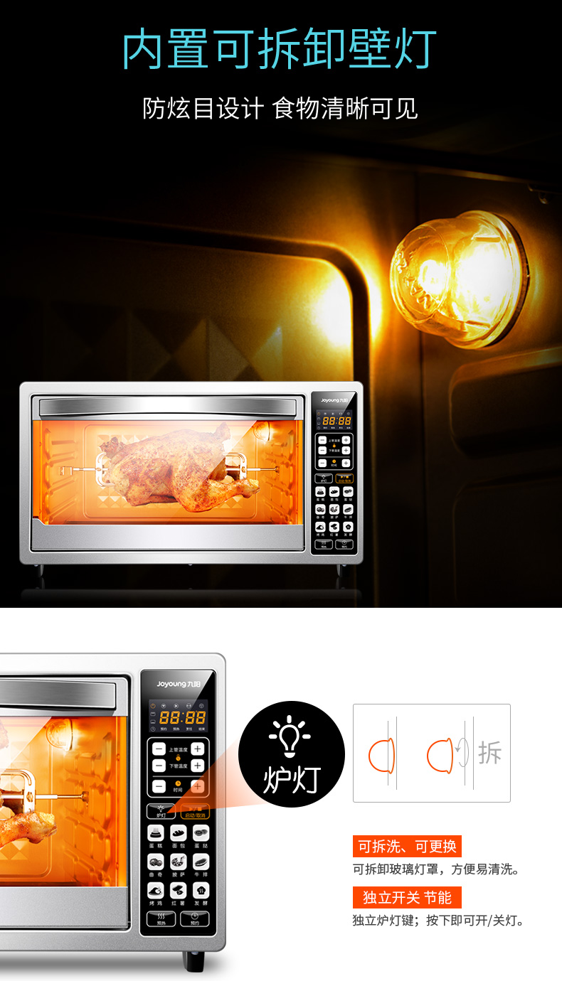 烤箱内部是三面加厚的搪瓷内胆,不怕油剂飞溅,油污一抹即净,耐刮易清洁。360°旋转烤叉,匀速转动烘烤,烤色均匀,皮脆肉嫩,内置可拆卸壁灯,方便易清晰。独立炉灯键,可以很好的防炫目,食物在制作过程中清晰可见。
