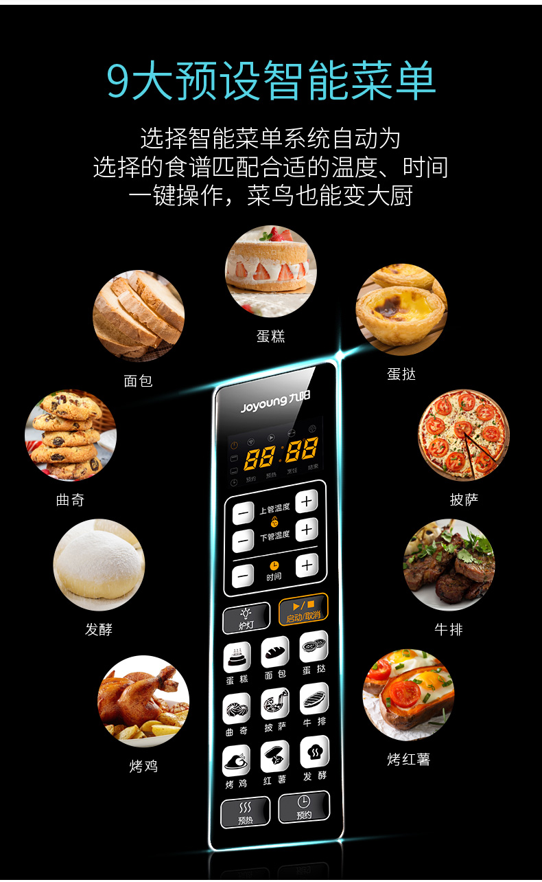 9大预设智能菜单,选择智能菜单系统自动为选择的食谱匹配合适的温度、时间,彻底的一键操作。菜单分别是烤鸡、发酵、曲奇、面包、蛋糕、蛋挞、披萨、牛排、烤红薯。