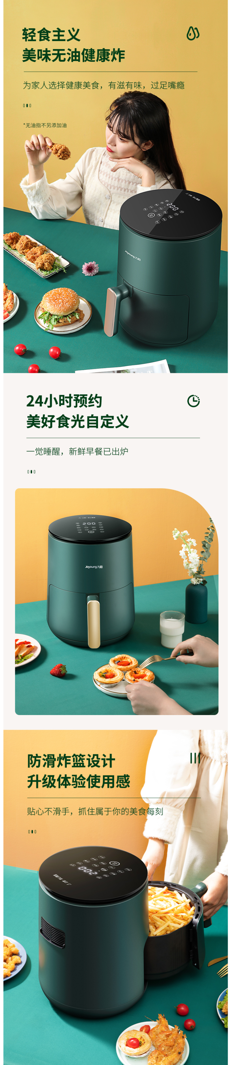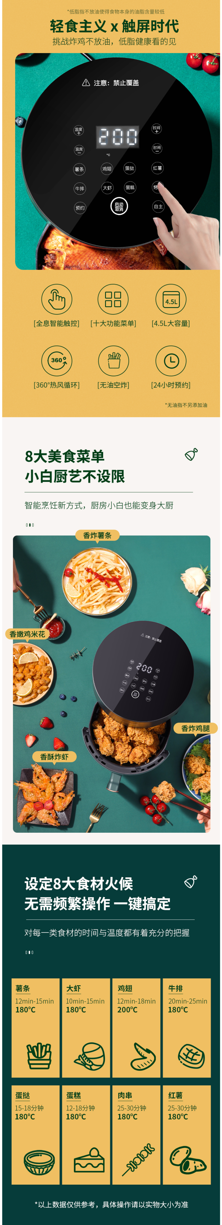 拥有8大预设菜单→薯条、牛排、鸡翅、大虾、蛋挞、蛋糕、红薯、烤肉,可24小时预约定时。锅内容量是4.5L,能满足6-8人可用,一般的空气炸锅只有2L。