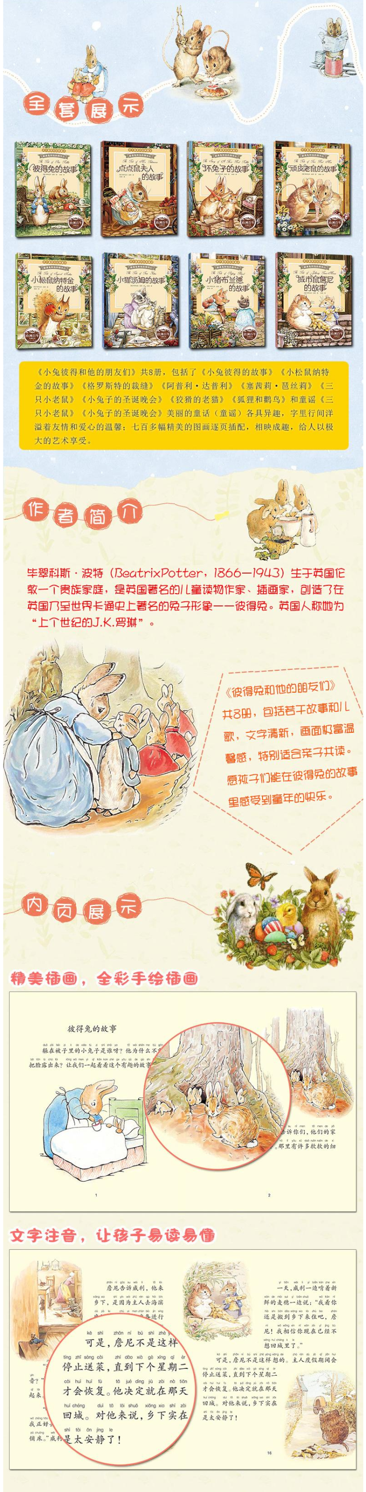 这款《彼得兔的经典故事》,共全套8册,每本有2~3个长篇幅经典故事,文字注音,让孩子易读易懂,彩图精美手绘插画,字迹工整,故事简洁明朗,孩子易懂。适合3~6岁及小学低年级儿童,最好亲子共读。