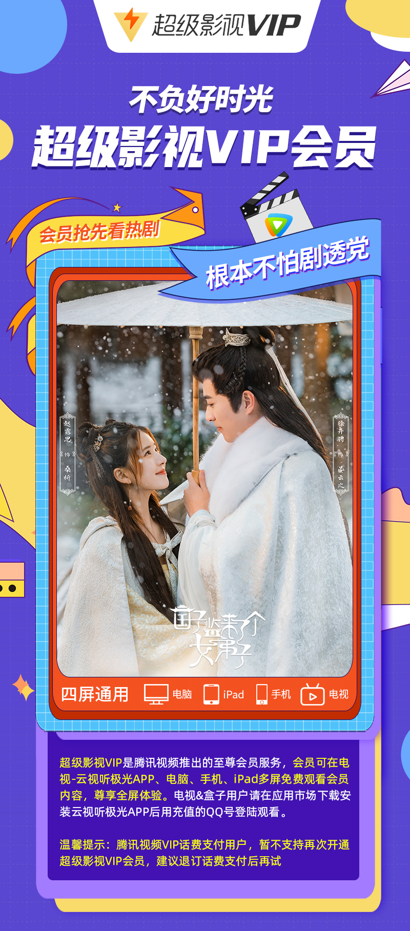 2.腾讯视频超级影视VIP支持电脑、平板、手机、电视、盒子。