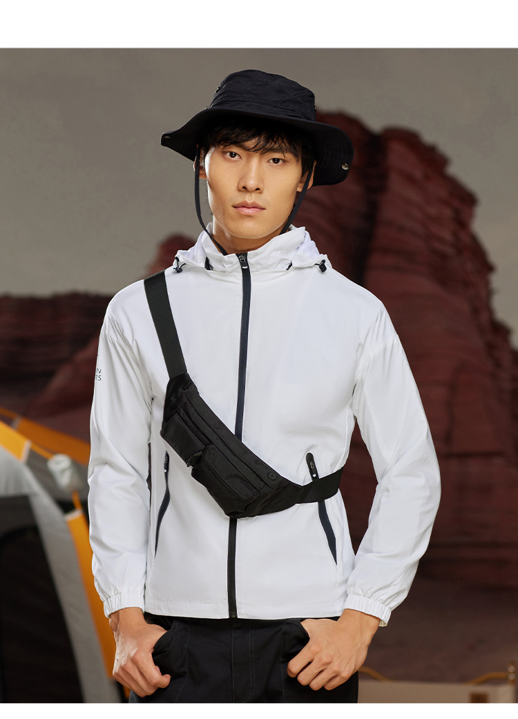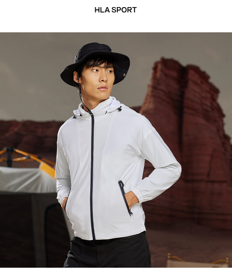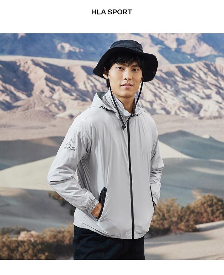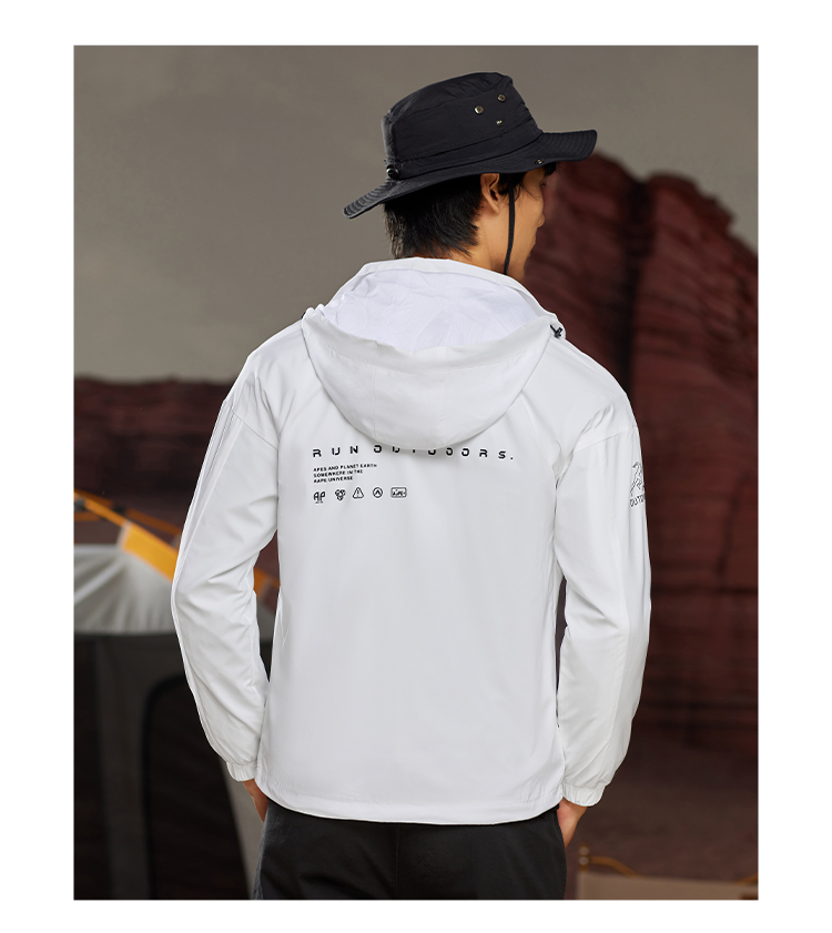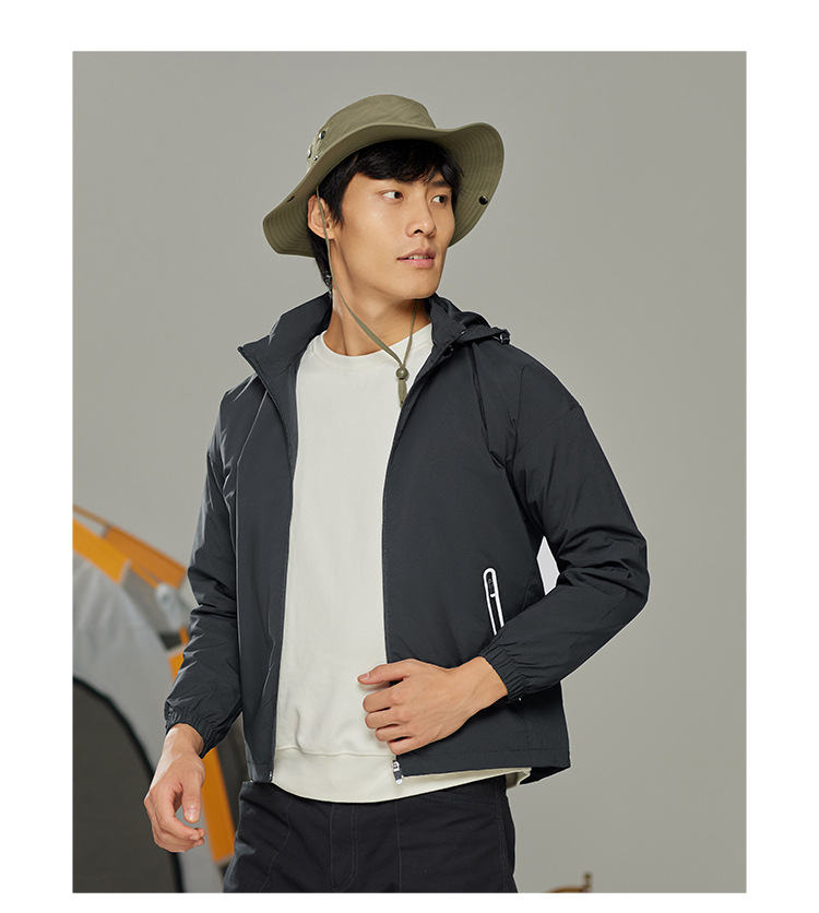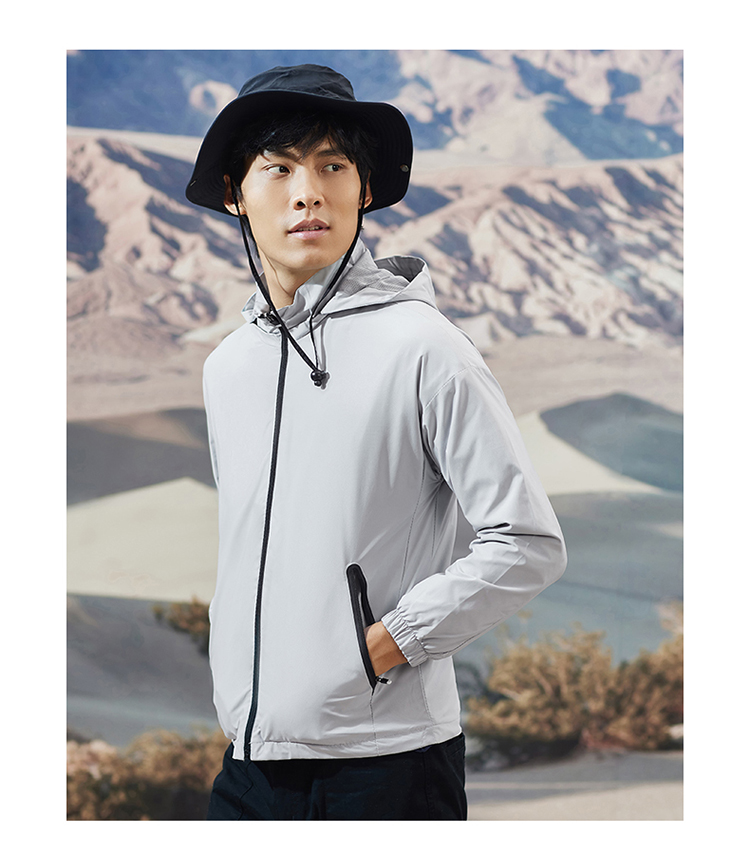 在款式上,合体版型,半高领,一体连帽,帽檐两侧有弹性抽绳调节松紧,束口收窄袖口,两侧口袋有拉链,边缘部分有封胶,避免进水。