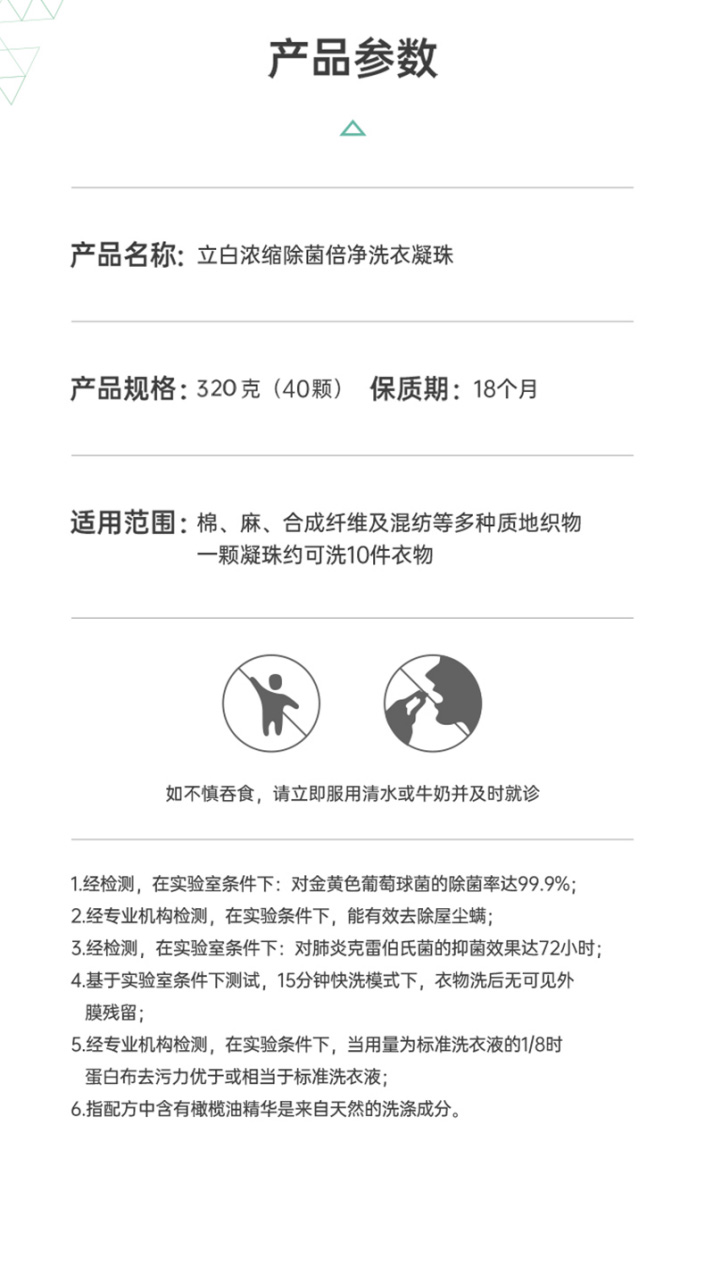 这款立白 天然倍净浓缩洗衣凝珠,专为机洗设计,植物活性剂配方,深层洁净,保护衣物纤维,水溶性外膜,低温也能溶解不残留,省心简单实用,8倍洁净力,99%除菌,高效去污,快洗无残留,洗后柔顺亮丽,清雅幽香,去除异味,留香悠长。适用于棉麻、混纺、合成纤维等质料衣物。