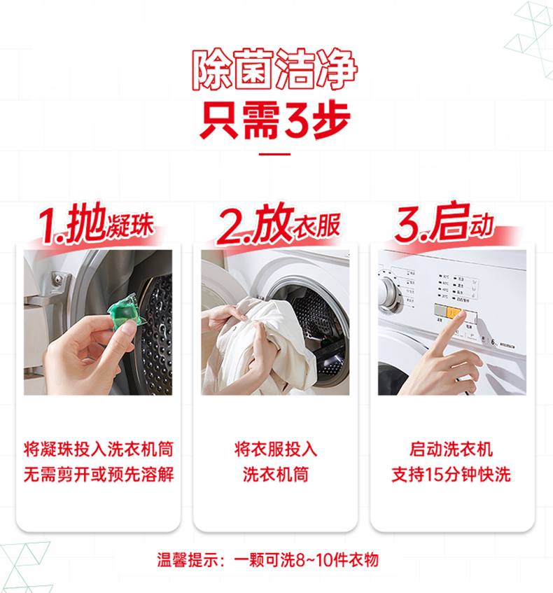99.9%除菌率 72小时长效抑菌 8倍洁净力。一颗洗一桶比买洗衣液还划算,8倍清洁力一盒可洗500件。
