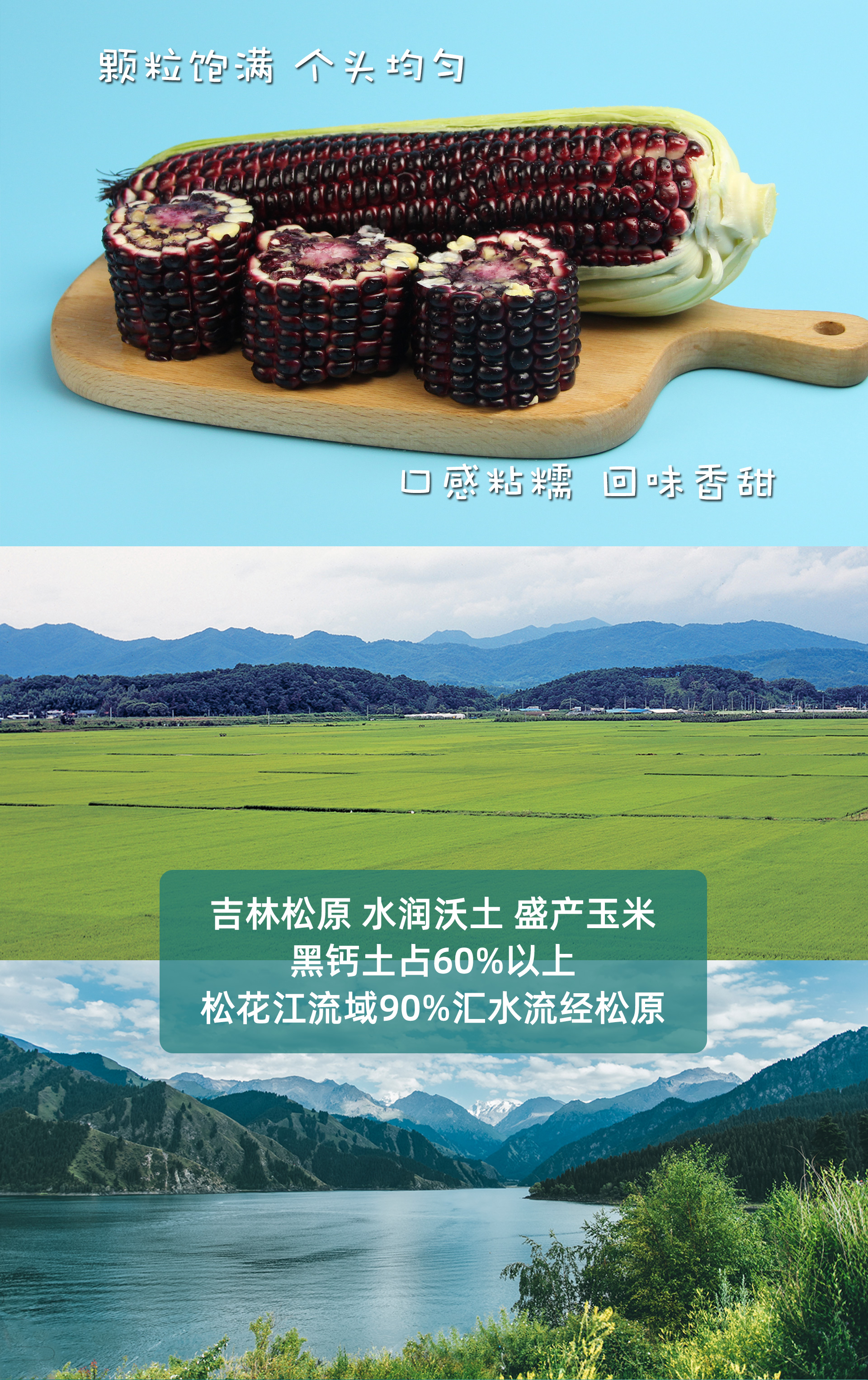 这款园侬鲜 黑玉米产地是吉林松原黑土地,是非转基因品种(虽然官方没有说转基因有害,但是尽量选择非转基因食品),玉米中含有丰富的花青素和微量元素是其它谷物的2-8倍,其中增强免疫力的赖氨酸高达0.45%,属于高赖作物,对人体有益,口感本身不甜,微黏、微糯,香味比较浓,非即食需蒸煮后食用。
