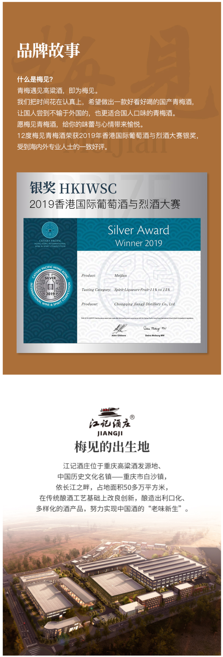 酿制方面:采用国家地理标志认证的普宁青梅,精选过大肉厚青梅,遵循传统工艺,采摘后72小时内糖渍工艺处理,历经90天缓慢出汁,保留纯粹青梅滋味。选用单一高粱酿造的高粱酒作为基酒跟其他白酒比起来口感更纯净,杂味更少,能更好的跟青梅融合,达到酸甜平衡没有杂味。