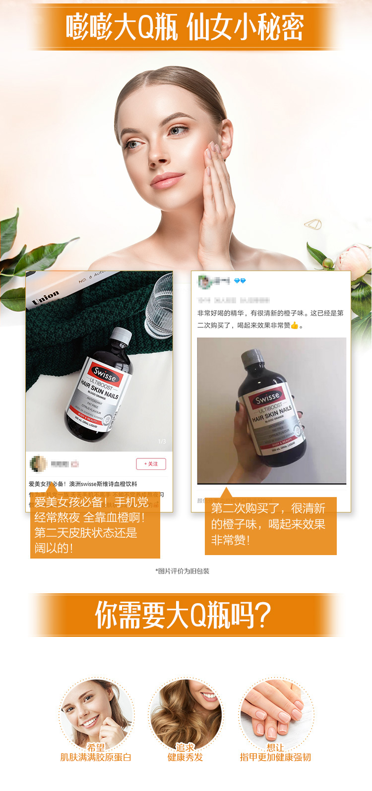 500ml大瓶装,每日服用10-15ml。基于科学研究,采用口感上佳的优质配方,含天然血橙提取精华,二氧化硅、维生素C。促进胶原蛋白的生成,保障健康的头发、肌肤、和指甲,提供必要的营养。具有提高细胞活性,光鲜亮丽肌肤、秀发和坚固指甲的作用。