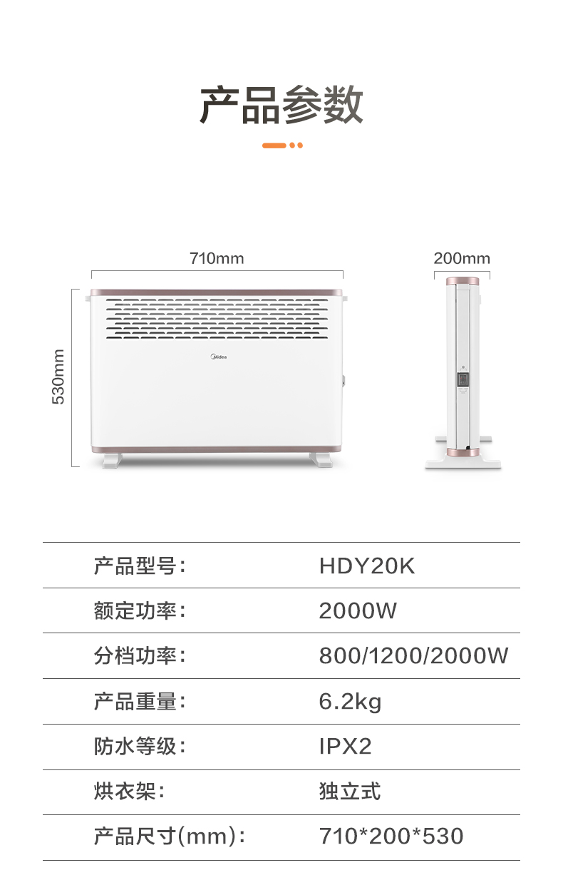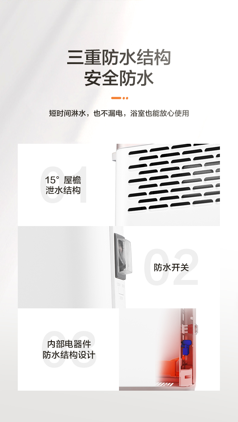智能控温,室温大于设定温度自动进入休眠状态,温度小于设定温度自动开启加热,保持恒温状态。IPX2级防水,三重防水结构,浴室也能使用,干湿两用,取暖烘衣两不误。