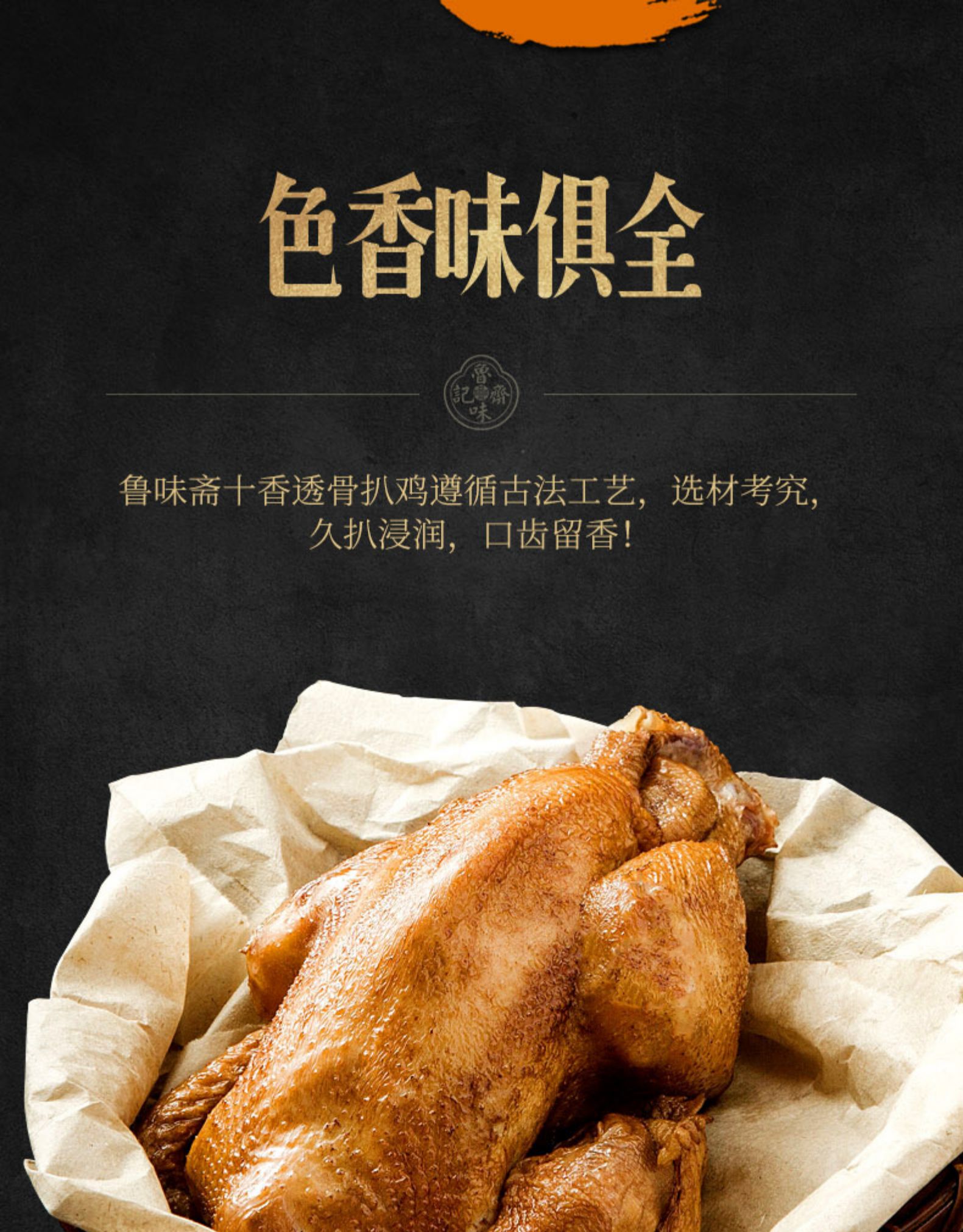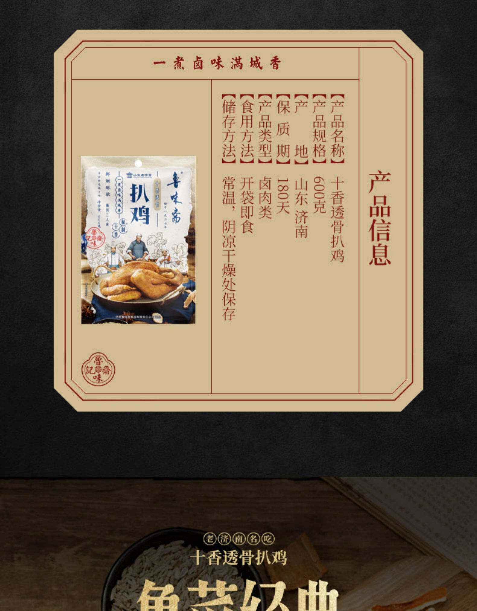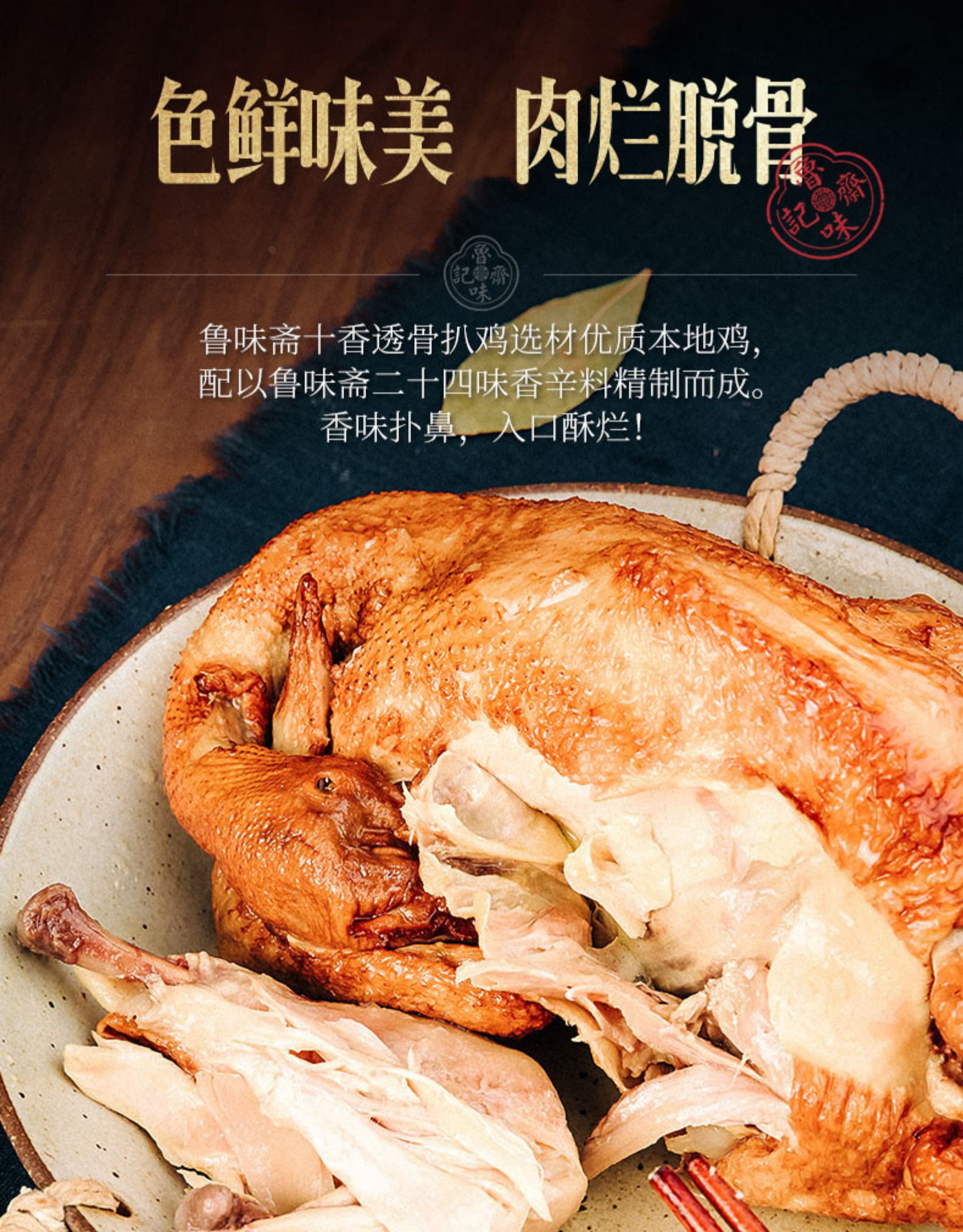 鲁味斋的四大件是扒蹄、扒鸡、扒肘还有凤爪,这款十香扒鸡甄选散养土鸡,运用古法工艺和多年传承的老汤卤制,文火慢炖,十香透骨,成品色泽金黄,肉质细嫩,细品回味无穷。规格为600g。