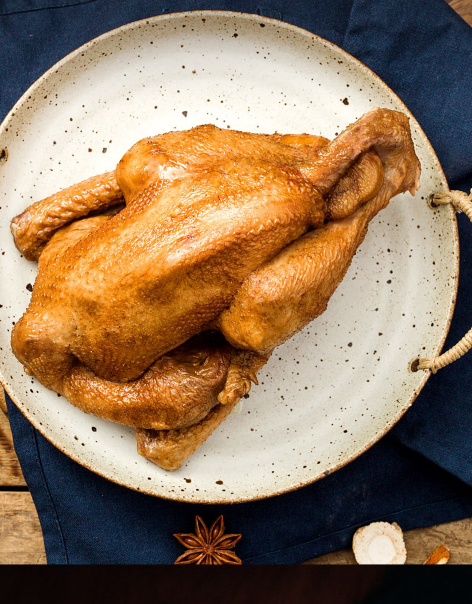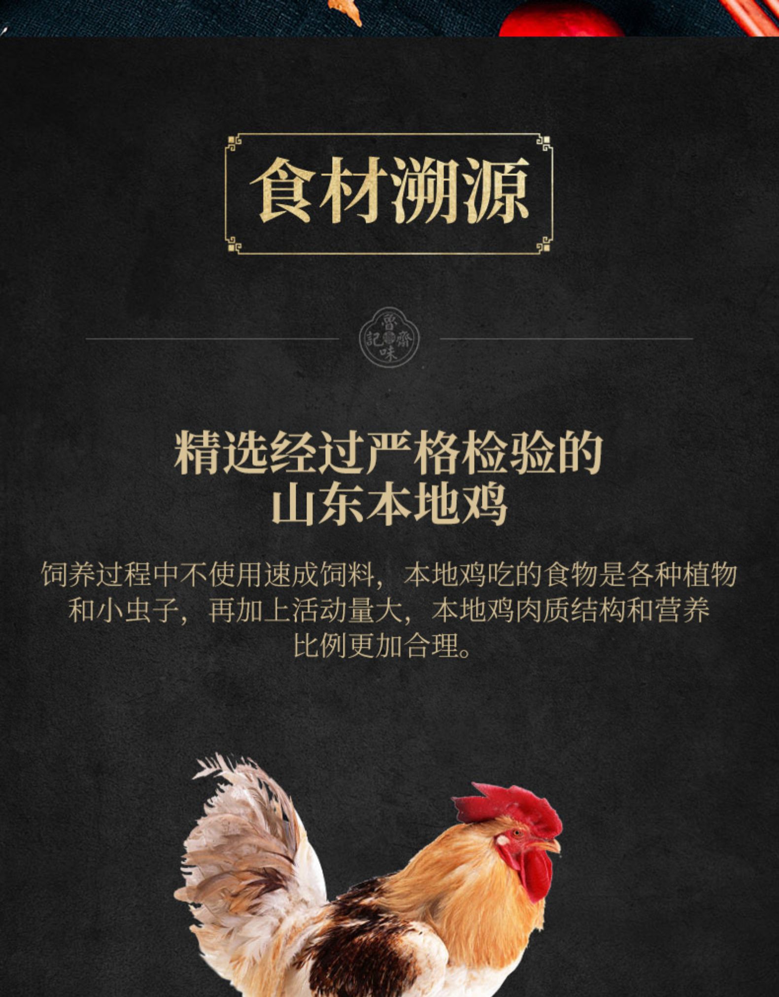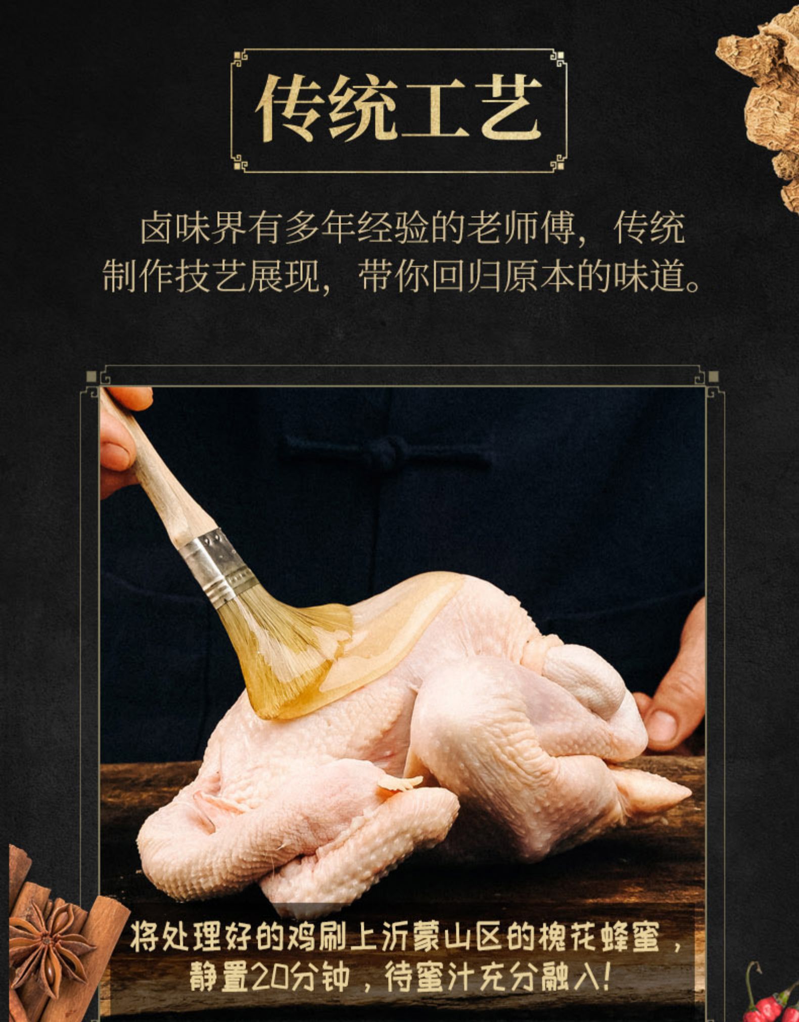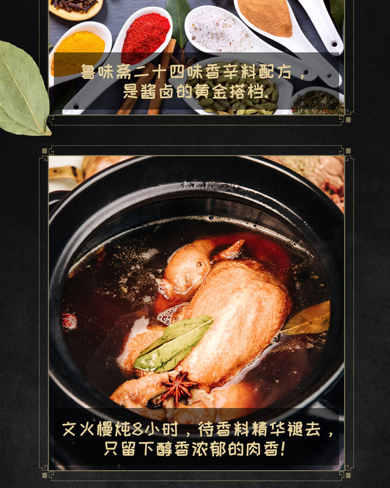 鲁味斋的四大件是扒蹄、扒鸡、扒肘还有凤爪,这款十香扒鸡甄选散养土鸡,运用古法工艺和多年传承的老汤卤制,文火慢炖,十香透骨,成品色泽金黄,肉质细嫩,细品回味无穷。规格为600g。