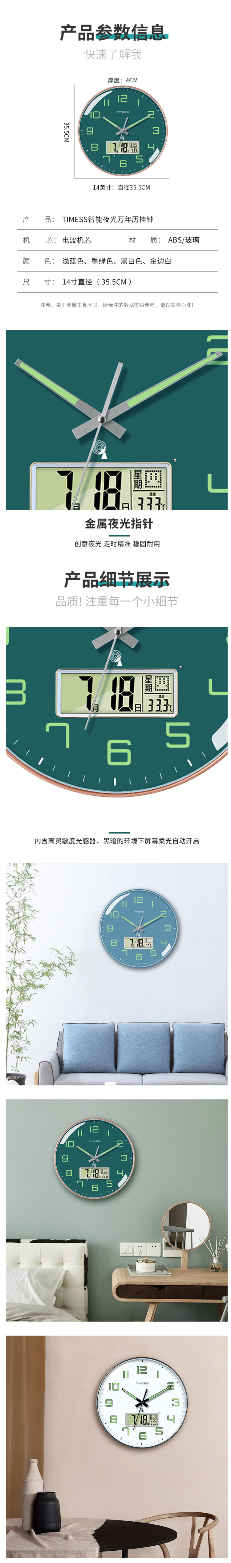 升级光感液晶屏,搭配高灵敏光感器,在黑暗的环境下屏幕柔光自动开启,在漆黑的夜里也能看清时间和万年历。能显示日期、星期、农历、温度。静音扫描机芯,走时无声不扰人。