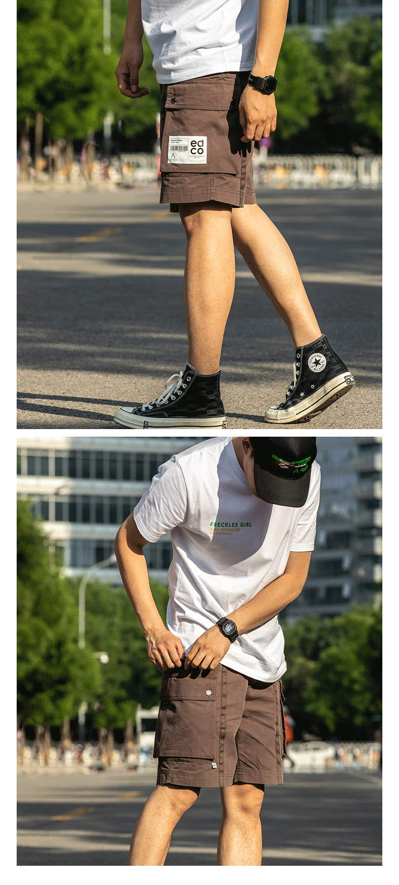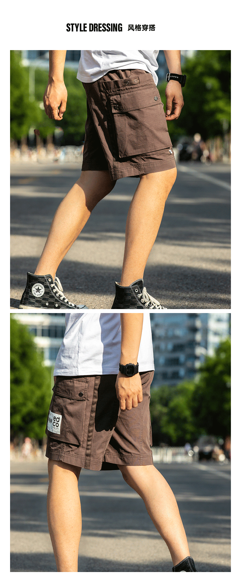 短裤以工装元素为灵感,还原了大口袋设计,兼具功能性与造型感,裤子在在洗水处理后,面料肌理舒适自然别具风格,同时腰侧添加调节织带,穿着舒适。