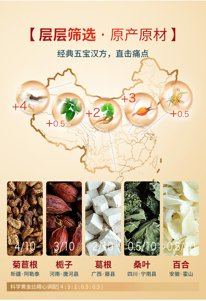 百年修正 菊苣栀子茶,精选新疆·阿勒泰 菊苣根、河南·唐河县 栀子、广西·藤县 葛根、四川·宁南县 桑叶、安徽·霍山 百合(按4:3:2:0.5:0.5科学黄金配比)、经过反复试验,不同材料研磨不同的粗细程度,使浸泡时析出快速全面,汤色澄亮,有淡淡清香,入口温和绵柔。食品级独立包装,双层保护,卫生便携。