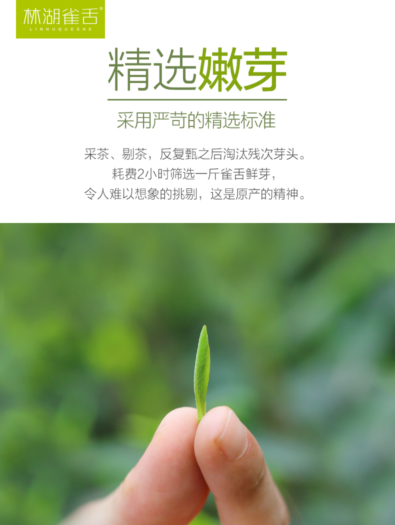 买1送1同款,到手共100g*2盒,这款林湖雀舌,产自早茶之乡宜宾,明前特级春茶。采摘实心芽头,50000个以上芽头出1斤特级雀舌,每颗芽头都是颜值派。芽头细嫩,色脆香幽,味醇形美,口感醇厚,顺口清甜。