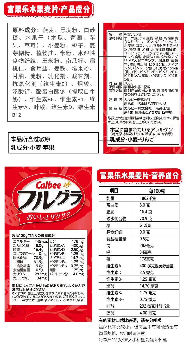 Calbee是日本销量第一的麦片,也是最好吃的麦片。这款含有草莓干、苹果干、木瓜干、葡萄干、南瓜子、大杏仁、椰子、燕麦、黑麦粉、糙米粉、麦麸、玉米粉等,丰富口感,富含膳食纤维、维生素和铁物质。