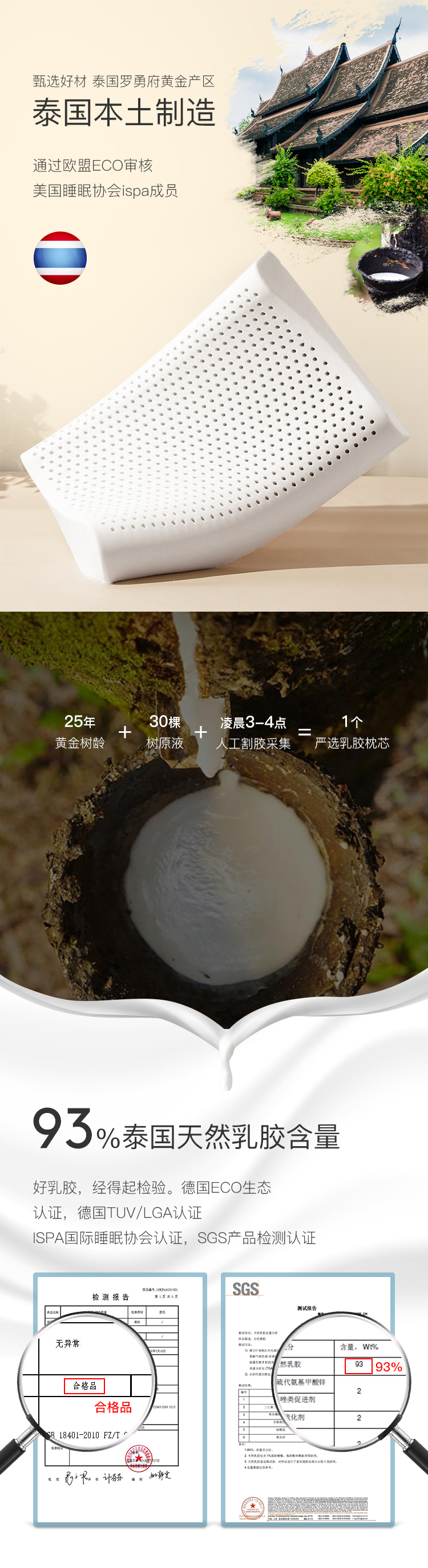 网易严选出品,泰国本土制造,通过欧盟ECO审核,美国睡眠协会ispa成员,品质靠谱。采用25年黄金树龄和30棵树原液,才制作一个枕头,90%天然乳胶含量,经德国ECO认证、SGS产品检测认证,使用健康无害。