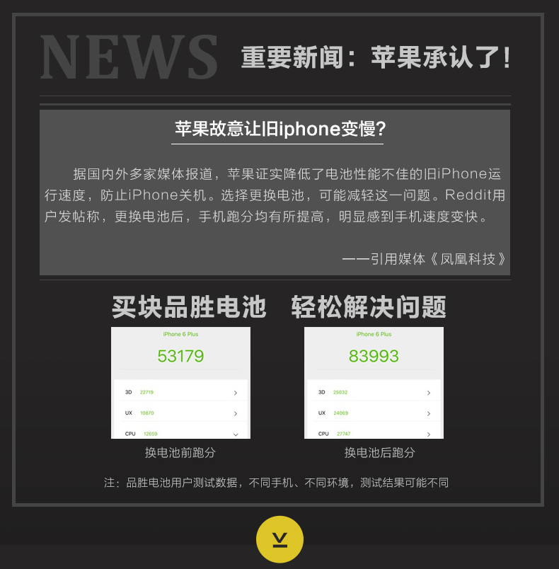 「苹果电池门」这是因为电池老化,苹果降低CPU频率以延长电池寿命的结果。在苹果设备的跑分软件中发现,更新iOS 11后,iPhone 6s分数从2500分左右,降到了1000-1500分之间。想解除降频限制,唯一的办法是换新的电池。